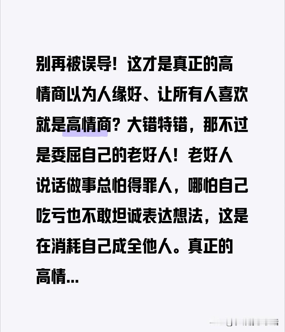 别再被误导啦!这才是真正的高情商 以为人缘好、人人喜欢就是高情商?大错特错,那只是委屈自己的老好人罢了! 老好人说话做事怕得罪人,自己吃亏也不敢坦诚想法,这是消耗自己成全他人。真正高情商,是为达目的投其所好,争取自身利益最大化,有目标有策略,而非迎合所有人。 在公司,想被所有人喜欢没用,讨好关键人物才重要。提高情商要洞察人心,精准投其所好。 你觉得身边谁情商高?评论区聊聊,点赞收藏,一起学高情商! 情商 高情商说话窍门 高情商处事方法 职场情商技巧