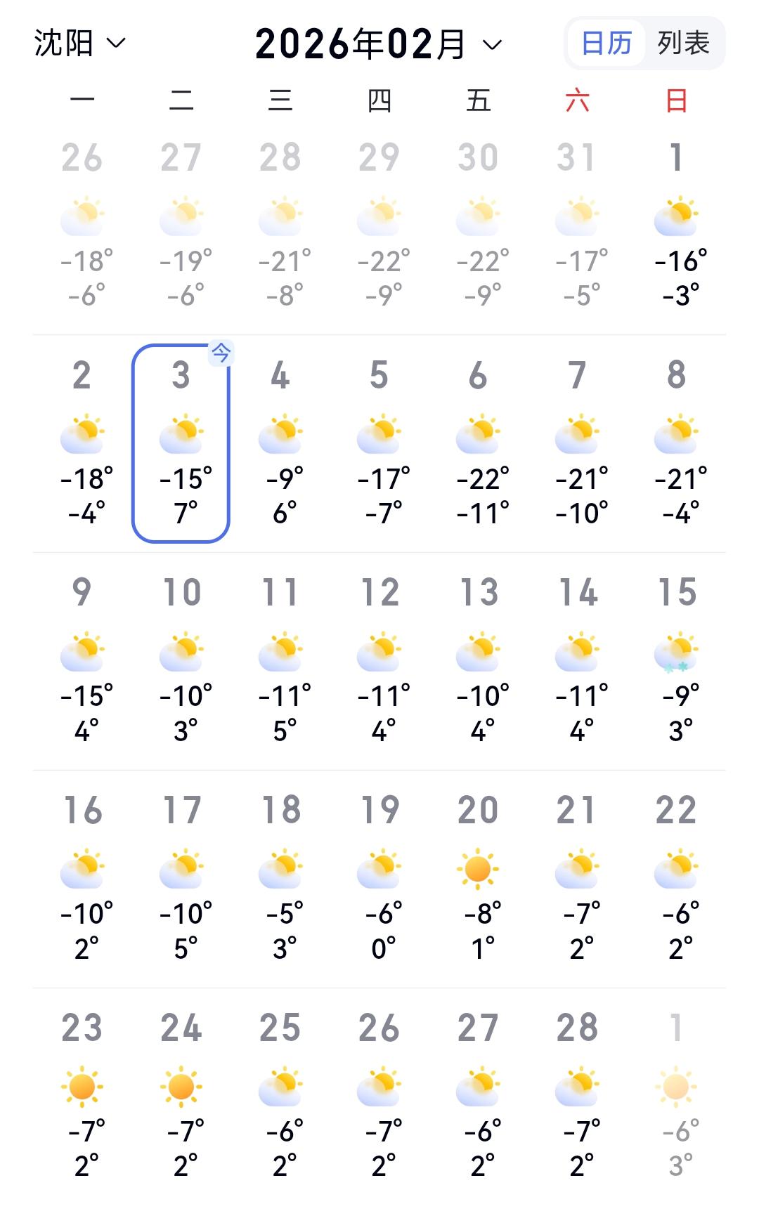 这要恭喜辽宁,已经度过了最寒冷的阶段,看来今年并没有比去年冷多少。只不过去年是2月份比较冷,今年是1月份比较冷。 从天气预报看2月份沈阳有22天白天是0度以上的天气,今天沈阳更是能达到+7℃,春节那几天沈阳要下起小雨,见此情景不禁感慨辽宁真的是一年比一年暖和。