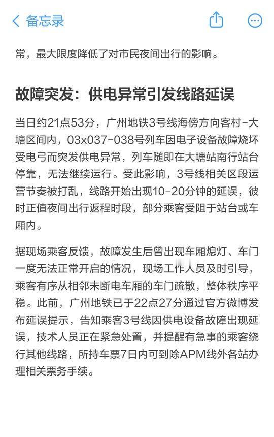 惊魂一刻!2.1广州地铁3号线突发供电故障 宝子们!昨晚广州地铁3号线的突发状况想必不少人都关注到了,2月1日21:53,海傍方向客村-大塘区间突发供电异常,03x037-038号列车因电子设备故障烧坏受电弓,直接停靠在大塘站南行站台无法运行,正值夜间返程高峰,3号线瞬间出现10-20分钟延误,不少乘客被困站台或车厢,现场还出现了车厢熄灯、车门一度无法开启的情况,好在工作人员及时引导,大家从相邻有电车厢有序疏散,全程秩序平稳,没有出现混乱情况。 故障发生后,广州地铁的响应速度真的很在线,22:27就通过官方微博发布延误提示,明确告知故障原因、预计延误时长,还提醒急事乘客绕行,车票7日内可办理相关票务手续,信息透明化直接拉满,也让滞留乘客心里有底。 为了快速疏导客流,运营方同步启动双线应急方案,22:38客村至大石区段正式开通应急公交接驳,给前往大石方向的乘客提供替代出行选择;22:48再次更新微博明确接驳安排,分流引导更精准。同时对3号线运营方案临时调整,机场北往海傍方向列车改在体育西路站折返,缩短运营区间保障核心区段运力,还贴心提示可换乘1、5、7、8、11、18、22号线及广佛线绕行,最大程度减少出行耽误。 最值得一提的是这次的拉风箱运营创新处置,为了避免客村-海傍段无车,北向列车在大石站后折返逆行至厦滘站实现单线双向运行,部分海傍方向列车在客村站站后折返,逆行至厦滘形成拉风箱模式,虽然北向大石以南段出现临时停车等待,但有效盘活了空置区间,保障了基本运力。这也是继2024年深圳地铁12号线三段式拉风箱运营后,大湾区轨道交通故障处置的又一创新实践,给后续应急方案优化提供了新参考。 经过约1.5小时的紧急抢修,供电故障彻底排除,设备检测达标后,次日0时左右3号线全线恢复正常运营,临时公交接驳同步终止,23:54官方发布恢复通知并致歉,完成了从故障通报、处置到恢复的完整应急闭环。 整体来看,这次处置全程遵循“快速反应、科学处置”原则,从故障监测、信息发布到客流疏导、抢修恢复,每一步都衔接紧凑,最大限度降低了夜间出行影响。后续运营方也会全面复盘故障原因,加强设备巡检维护、优化应急预案,相信能给市民带来更安全顺畅的出行保障~ 另外运营配线图在后面 (注:部分运营细节为网络整合,不一定准确,仅供参考) 广州地铁 广州地铁3号线 应急 供电故障 轨道交通