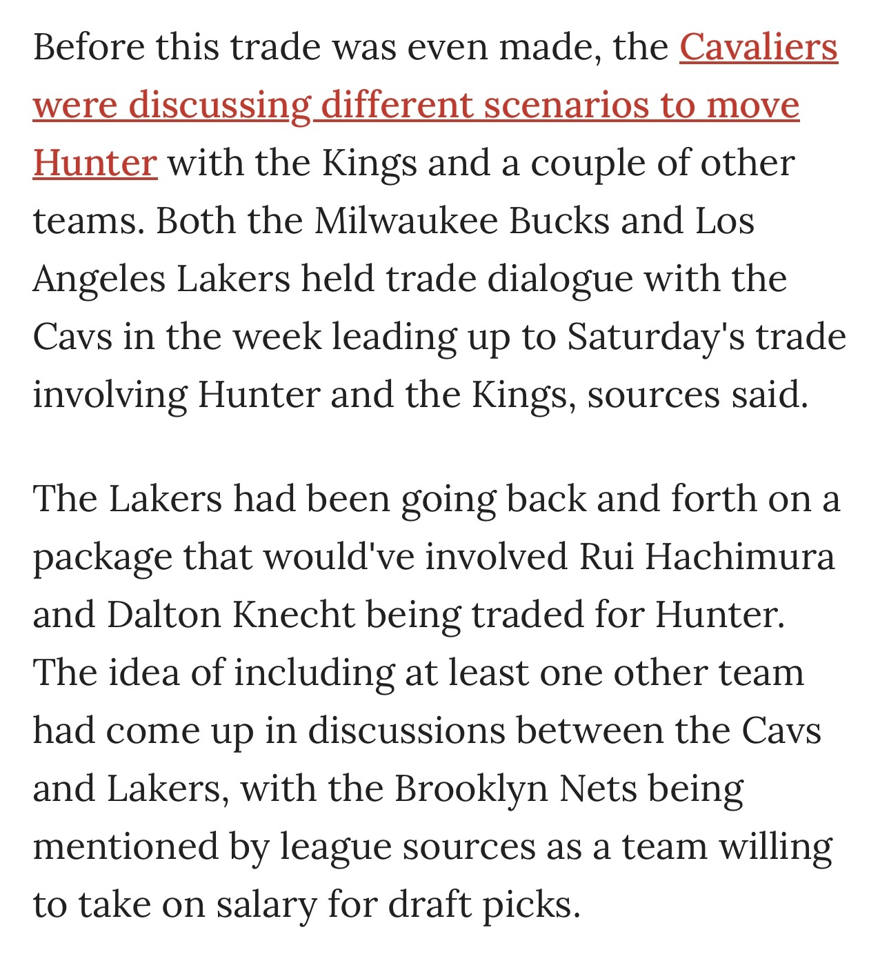 早在骑士国王公牛的三方交易达成之前,骑士就已经在和国王以及其他几个队探讨交易亨特的各种方案。