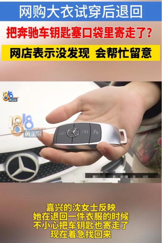 嘉兴,女子网购退衣服时,不慎将奔驰车钥匙放在口袋里一起寄走了,重新配一把需要6000多块钱,她希望商家帮她走回来!商家:没看到车钥匙,退回的衣服又卖出去给别的顾客了!网友:试穿衣服我们把车钥匙放口袋里?不合适就直接退啊!   一件158块钱的网购大衣,居然让她面临6000多块钱的损失。这到底是怎么回事呢?   原来,沈女士的奔驰智能钥匙莫名不见了。这把奔驰车钥匙造价可不低,重新配一把就得六千多块,换做是谁遇上这事,心里都会急得不行。   而商家那边的回应称仓库每天要处理上百件的退货包裹,工作量本就很大,再加上仓库内部并未安装监控,没有相关的影像记录,对于沈女士的情况,实在没办法核查清楚。   更何况整理退货衣物的都是临时工,大家手头活儿多,只顾着赶紧分拣打包,根本没人会留意、也不会特意去检查衣服口袋里有没有夹带东西。   小区监控记录得明明白白,1月7日晚上,她穿着刚收到的新大衣下车,随手就把奔驰车钥匙塞进了大衣口袋里。   那天天气特别冷,她的大衣送到了小区里面的驿站。因为不想冒着凉风跑第二趟,就开着车去取包裹,直接在车里拆开来试穿了。   试穿后发现,这个大衣的版型不太合适,肩线太宽了,所以沈女士当场就决定退货。   她想着反正很快就到家换睡衣,在车上换衣服实在是折腾,索性就穿着没拆吊牌的新大衣,还顺手把车钥匙塞在了大衣口袋里。   直到第二天打包退货,沈女士也压根没想起,那把奔驰钥匙还安安稳稳躺在大衣的口袋里。   等沈女士发现车钥匙消失了,把家里翻了个底朝天也没找见踪影时,才猛然想起前几天退掉的那件大衣,她才想起来,钥匙八成是落在大衣口袋里,寄走了。 于是她赶紧调出家里的监控查看,一看便瞬间清楚了,那把奔驰钥匙大概率就是跟着退货包裹,一起寄回给商家了。   她心里又懊恼又无奈,她自认有疏忽,但也觉得商家收到退货时,理应细心检查下衣服口袋,若能多这一步,或许就能避免这场钥匙丢失的麻烦了。   有人觉得,这事根源还是她做事不够细心,试穿完大衣没检查口袋就直接退货,才平白引发了这场丢钥匙的麻烦。   也有人认为商家同样有责任,退货查验本就是该有的基本流程,不能以“人手不足”“仓库无监控”为借口,敷衍了事,忽略了对退回商品的基础检查。   现在大家都爱网上购物,七天无理由退货确实方便,但退货流程里,既没有针对贵重物品的风险提示,商家也缺少完善的查验机制。   生活里类似的情况并不少见,有人退货时不小心寄走了口袋里的现金,有人遗落了心爱的首饰,等到发现时,商品早就流转到了下一位买家手里,想找回难如登天。   沈女士的经历给所有人提了个醒。退货之前,衣服的口袋、包包的夹层、鞋子的内里,都要逐一翻查,确认没有遗落贵重物品再寄出。   商家和购物平台也该多上点心,完善退货查验的流程,别让这类因疏漏造成的麻烦,再发生在消费者身上。   不妨增设一个简易的退货查验环节,收到退回商品后花几分钟仔细检查一番,既能减少消费者的财物损失,也能规避后续的各类纠纷,对买卖双方而言,无疑是一举两得的举措。   希望这起事件能让大家都引以为戒,不管是退货还是寄快递,都多留个心眼,让这样的乌龙闹剧少一些,让网购既方便又安心。