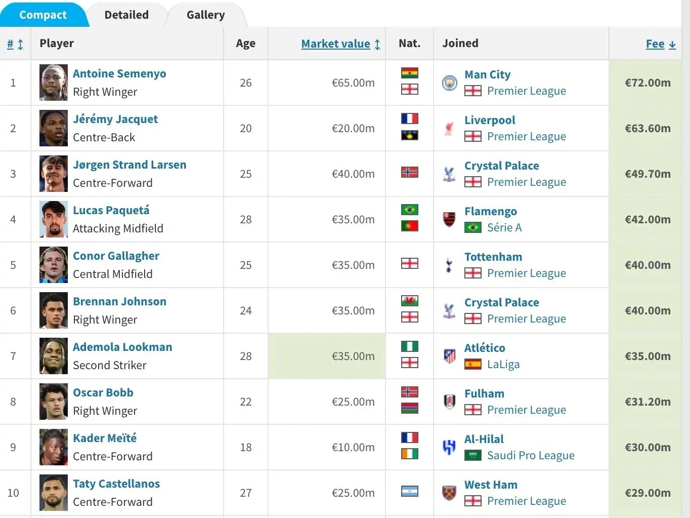 “这个冬天,有点冷”。欧洲五大联赛的冬窗陆续关闭,各支球队的引援工作也已经尘埃落定。相比于夏窗的喧嚣,本赛季冬窗则略显沉寂,大多数球队都选择补强。塞门约成为了冬窗标王,曼城以7200万欧元签下,成为了冬窗最贵交易。冬窗转会费前10(德转数据)1、塞门约(伯恩茅斯→曼城)7200万欧2、雅凯(莱恩→利物浦)6360万欧3、拉森(狼队→水晶宫)4970万欧4、帕奎塔(西汉姆→弗拉门戈)4200万欧5、加拉格尔(马竞→热刺)4000万欧6、布伦南-约翰逊(热刺→水晶宫)4000万欧7、卢克曼(亚特兰大→马竞)3500欧8、鲍勃(曼城→富勒姆)3120万欧9、梅特(雷恩→利雅得新月)3000万欧10、卡斯特利亚诺斯(拉齐奥→西汉姆联)2900万欧曼城