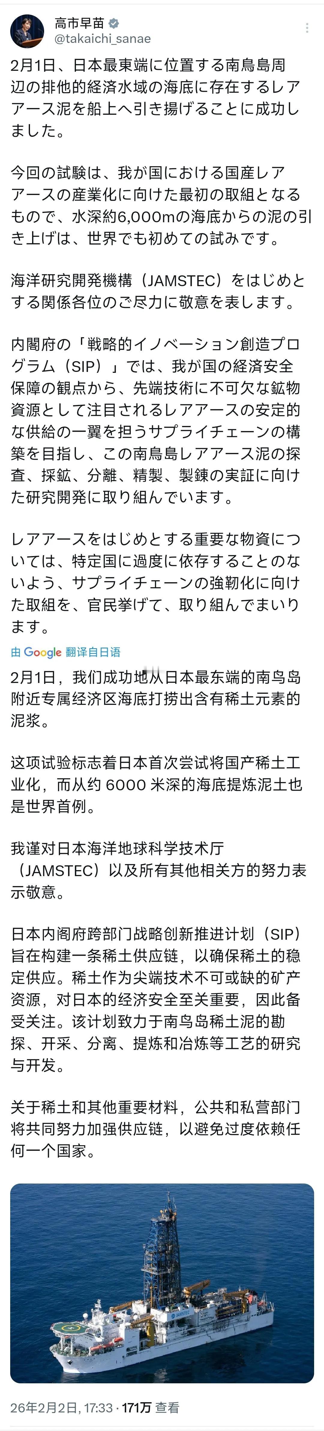 日本首相高市早苗2月2日写道:“2月1日,日本成功以位于最东端南鸟岛周边专属经济区的海底,将稀土泥打捞至船上。本次试验标志着日本迈出实现稀土国产化的第一步,从约6000米的海底提取稀土泥更是全球首例……关于稀土和其它重要材料,为避免对特定国家的过度依赖,政府与民间将携手强化供应链韧性。” 完全是高市早苗的政治操弄和选举考量而已,从5600米深的海底吸取的淤泥,是否稀土淤泥、丰度如何、包含哪些稀土元素等都有待于在实验室中进行分析验证。接下来还要进行勘探,落实淤泥稀土矿厚度、面积,计算出稀土储量,才能确定有无工业开采价值。如果上述问题落实,还要开始开采、运输设备的研发和试运行,到2028年才能工业开采。最关键的问题是其采矿成本是中国的数十倍之多,日本的萃取技术还停留在4N级阶段,一个不含重稀土关键元素的稀土矿,成色及前景如何众所周知。