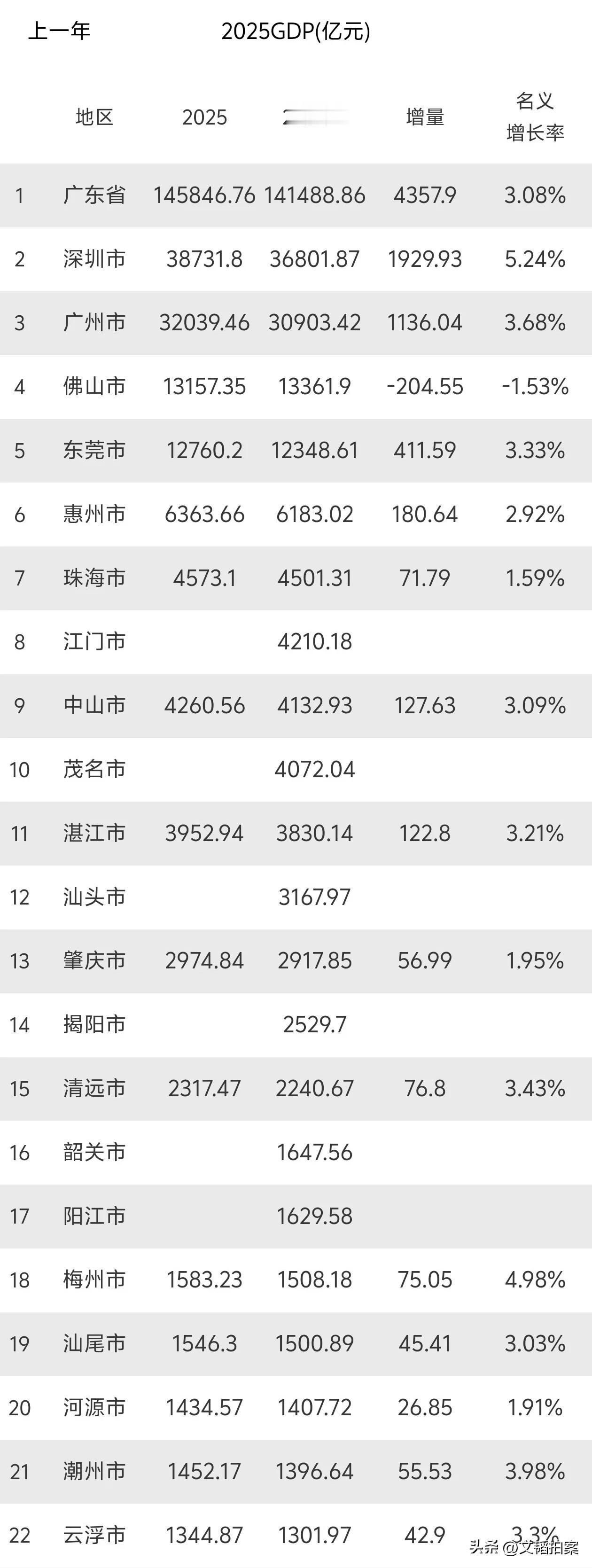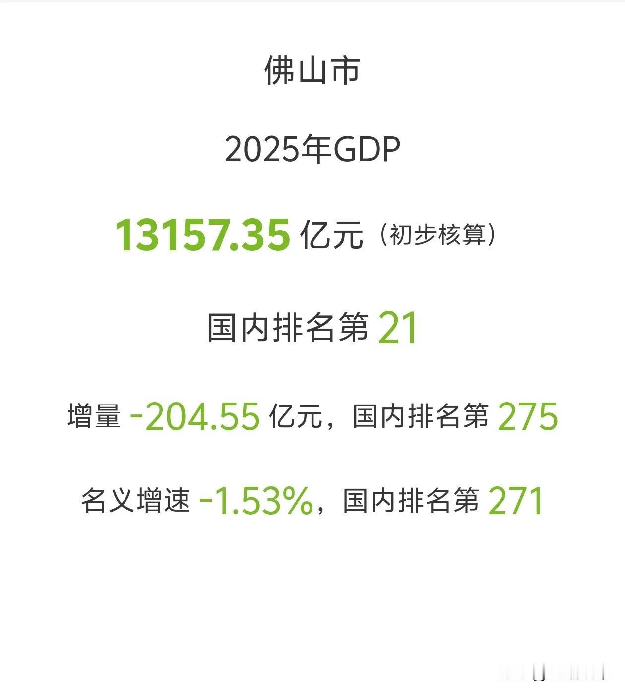 佛山GDP公布,总量13157.35亿,增量竟然是负204亿,是目前唯一负增长的万亿城市。可见佛山这几年的压力,确实不小。 很多人可能不知道,佛山GDP曾经一度高居全国前十,如今前二十都不保。过度依赖房地产上下游产业的效果显现了。 佛山是广东四大火车头之一,如今已经熄火了一个,广东增量怎么搞得起来?广东gdp 佛山 佛山gdp增速 佛山市gdp 佛山发展