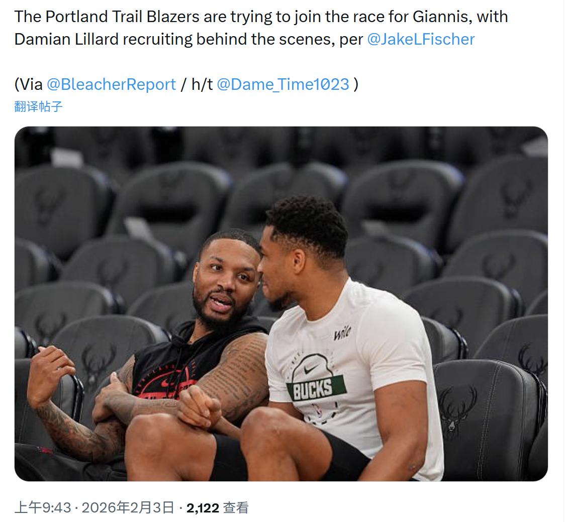 Jake Fischer今天消息有点多:开拓者尝试加入字母哥争夺战,利拉德在幕后招募了字母哥。