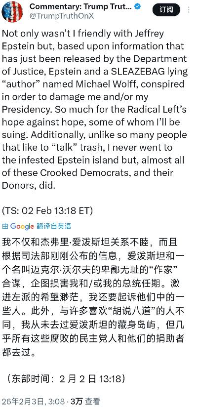 特朗普表示自己没去过爱泼斯坦的肮脏岛屿!特朗普今天(北京时间2月3日)发文写道:“我不仅和杰弗里·爱泼斯坦关系不好,而且根据司法部刚刚公布的信息,爱泼斯坦和一个名叫迈克尔·沃尔夫的卑鄙无耻的‘作家’合谋,企图损害我和/或我的总统任期。激进左派的希望渺茫,我还要起诉他们中的一些人。此外,与许多喜欢‘胡说八道’的人不同,我从未去过爱泼斯坦的藏身岛屿,但几乎所有这些腐败的民主党人和他们的捐助者都去过。” 这条动态的导火索,是三天前司法部公布的第13批爱泼斯坦档案。足足2000页的文件里,"特朗普"这个名字出现了117次,包括受害者证词、爱泼斯坦的电话录音,甚至2016年大选前某晚的密谋对话。最扎眼的是2015年弗吉尼亚·朱弗雷的证词:"爱泼斯坦说带特朗普来岛上玩,能让他在佛罗里达的选票翻倍。" 但特朗普的反击早有伏笔。去年7月他接受福克斯采访时,就详细描述过"赶走爱泼斯坦"的细节:"那家伙总在我的水疗中心晃悠,盯着做按摩的小姑娘。有次他想挖走我的领班,我直接把他会员拉黑。"当时台下观众鼓掌欢呼,没人注意到他刻意回避了"岛屿"这个关键词。 这次文件里的新料,是爱泼斯坦2016年2月和作家迈克尔·沃尔夫的邮件。沃尔夫提议:"如果在大选前曝光你和特朗普的游艇派对照片,足够让福音派选民倒戈。"特朗普现在揪住这点不放:"沃尔夫收了爱泼斯坦50万,专门编造我和岛屿的谣言!"熟悉美国政斗的人都知道,沃尔夫正是2018年写出《火与怒》的那位"特朗普黑历史收集者",当年书中爆料特朗普吃汉堡看动画片的细节,曾让白宫鸡飞狗跳。 司法部的"澄清"来得很微妙。文件第478页注明:"所有针对特朗普的性侵指控均缺乏物证,且受害者陈述存在时间线矛盾。"但这句话被反特朗普阵营抓住把柄——"没物证不等于没发生",CNN评论员举着2002年特朗普夸赞爱泼斯坦的采访录像:"杰夫爱美女,我也爱,而且他更喜欢年轻的。"这段被翻出的旧视频,让"没去过岛"的声明显得更苍白。 真正让特朗普焦虑的,是文件里的"对比杀"。同批曝光的还有纽约房地产商安德鲁·法卡斯的邮件,2018年他给爱泼斯坦写信:"亲爱的杰弗里,谢谢你的岛屿假期,那些姑娘让我找回20岁的感觉。"落款是三个亲吻表情。而法卡斯去年刚在公开信里发誓:"我和爱泼斯坦只有商业往来。"这种"当面一套背后一套"的操作,正是特朗普最害怕的舆论模板。 特朗普的团队很清楚,选民对"权贵淫岛"的想象,远比法律细节更致命。他们迅速甩出2010年海湖庄园的监控——爱泼斯坦被驱逐后,特朗普确实再没出现在爱泼斯坦的私人飞机乘客名单上。但尴尬的是,2004年的飞行记录显示,特朗普曾搭乘爱泼斯坦的"萝莉快车"去过美属维尔京群岛,虽然目的地是主岛圣托马斯,而非爱泼斯坦的小圣詹姆斯岛。 这场舆论战的底层逻辑,是共和党精心设计的"甩锅战术"。特朗普在声明里特意提到:"几乎所有腐败民主党人和他们的金主都去过那岛。"这话半真半假——文件里确实有克林顿26次登岛的记录,还有前财政部长拉里·萨默斯的按摩预约单。但共和党选择性忽略了一个事实:爱泼斯坦的"客户名单"里,62%的捐赠者曾给共和党捐款。 最讽刺的是司法部的"客户名单"辟谣。2025年7月FBI曾宣布:"没有证据表明爱泼斯坦掌握权贵把柄。"但这次公布的文件里,赫然有麦克斯韦的证词:"杰弗里总说,克林顿的瑜伽裤照片能换三个内阁职位。"这种前后矛盾,让吃瓜群众更相信:所谓"名单",不过是两党互相牵制的政治武器。 特朗普的支持者显然吃这一套。在他的声明下,点赞最高的评论是:"拜登的儿子嫖妓都能当总统,特朗普不去岛反而有罪?"这种话术精准击中了美国底层的愤怒——当爱泼斯坦案变成权贵们的"罗生门",普通选民只关心谁在说谎时更笨拙。 现在回看特朗普的"岛屿否认",本质是场精心计算的政治赌博。他赌选民记不住2004年的飞行记录,赌民主党不敢深挖自己的黑历史,更赌"反精英"情绪能盖过事实细节。就像他2016年赌赢了"更衣室录音"一样,这次他依然在赌:美国选民,到底更讨厌权贵的堕落,还是更痛恨虚伪的道德审判?