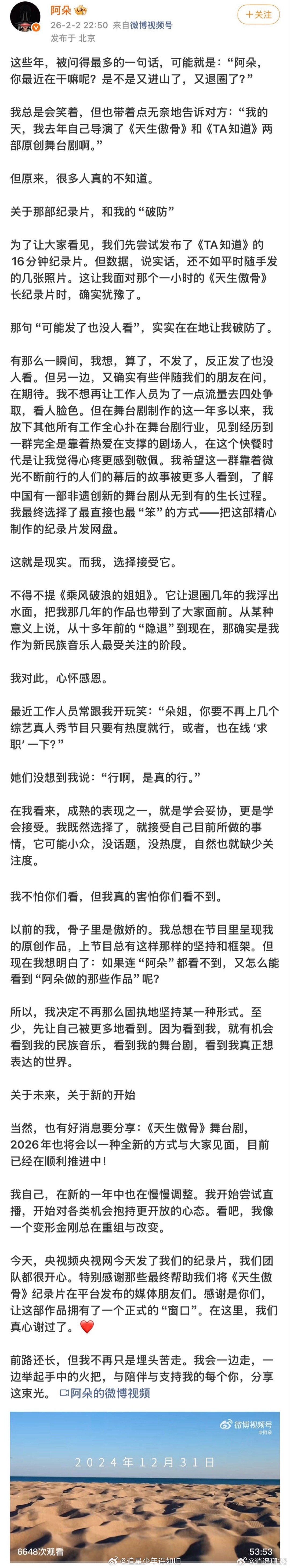 阿朵回应退圈传闻 退圈?不存在的!阿朵发长文回应不实猜测,直言这些年始终专注原创创作,去年还顺利完成两部舞台剧的执导工作,只是苦于作品无人知晓,未来将用直播开启新尝试。