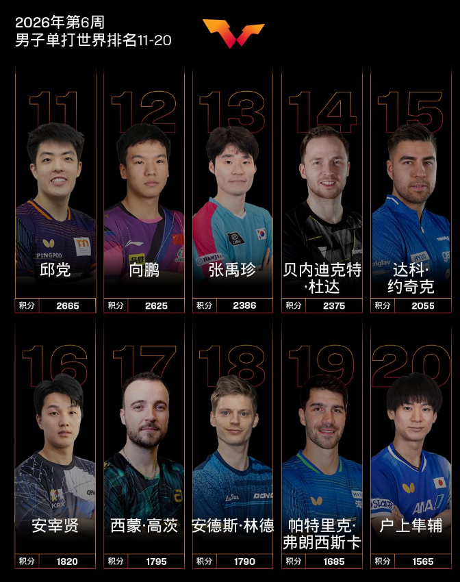2月2日,WTT世界乒联公布2026年第6周男、女单世界排名。 男子单打,中国队