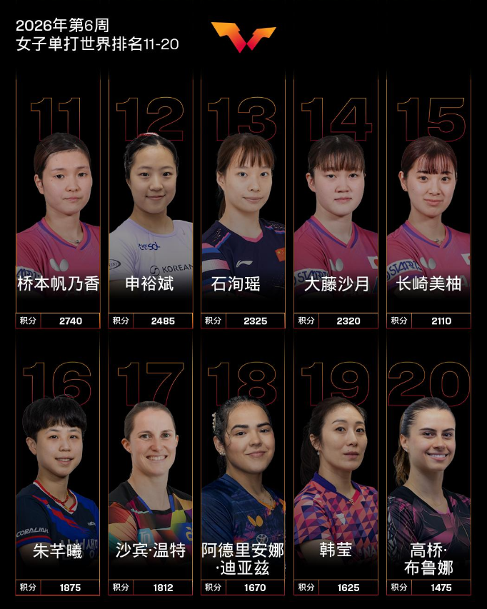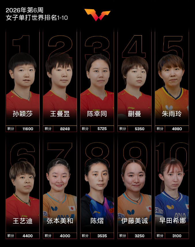 2月2日,WTT世界乒联公布2026年第6周男、女单世界排名。 男子单打,中国队球员王楚钦、林诗栋位列前二,梁靖崑位列第七。 国际乒联大洋洲杯男单冠军卢伟排名上升9个名次位列第40;维姆·维东斯霍特排名上升18个名次位列第73,刷新个人职业生涯排名新高;朱尔斯·罗兰排名上升11个名次位列第78;徐瑛彬排名上升13个名次位列第94。 其他中国队球员,向鹏排名第12,周启豪排名第23,温瑞博排名第24,陈垣宇排名第27,陈俊菘排名第37,黄友政排名第41,薛飞排名第47。女子单打,中国队球员孙颖莎、王曼昱、陈幸同、蒯曼位列前四,王艺迪位列第六,陈熠位列第八。 国际乒联美洲杯女单冠军王艾米排名上升22个名次位列第39;WTT支线赛多哈站女单冠军杨屹韵排名上升14个名次位列第50,刷新个人职业生涯排名新高;亚军朴佳贤排名上升12个名次位列第64;阿德里安娜·迪亚兹排名上升1个名次位列第18;卡米尔·卢茨排名上升14个名次位列第85。 其他中国队球员,石洵瑶排名第13,何卓佳排名第27,覃予萱排名第37,钱天一排名第43,纵歌曼排名第45。