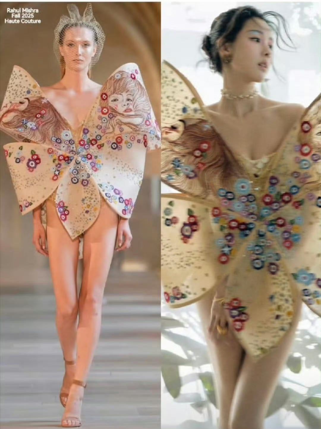陈都灵花蝴蝶高定 陈都灵身披花蝴蝶高定礼服亮相红毯,每一缕裙摆都像蝴蝶振翅的轨迹,轻盈灵动的薄纱缀满碎钻,在灯光下流转出细碎星芒。她步履轻移时,裙身蝴蝶刺绣仿佛被风唤醒,从肩颈振翅至裙摆,将东方古典的雅致与西式剪裁的利落完美融合——是蝶吻花枝的诗意,也是红毯上最惊艳的春日序章。这件礼服的设计师以“破茧成蝶”为灵感,用立体刺绣勾勒蝶翼纹理,腰线处的收褶如蝶蛹束缚,下摆的流苏则似蝶翼舒展,让陈都灵在红毯上完成了一场从“茧”到“蝶”的蜕变美学,连发丝都透着仙气,是当之无愧的红毯“蝶仙子”!