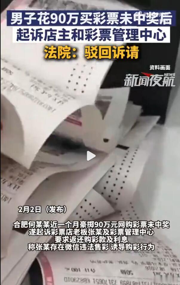 不是哥们,买彩票这事儿本来就是图一乐,随手买个几块钱的,就当个电子榨菜了,你怎么还当真了?而且居然能花90万元买彩票,恕我直言,这不叫彩民,这叫赌狗。你不会认为中奖概率是平均分布吧?真要是砸钱就能中大奖,那澳门岂不是个个都是巨富?况且,咱们这边的彩票究竟是个什么情况,相信大家懂的都懂,在这种明摆着的事情上这么用心,只能说某些彩民真是信息茧房了…..男子90万买彩票未中奖起诉彩票中心男子花90万买彩票未中奖起诉老板男子90万购彩未中奖起诉老板被驳回