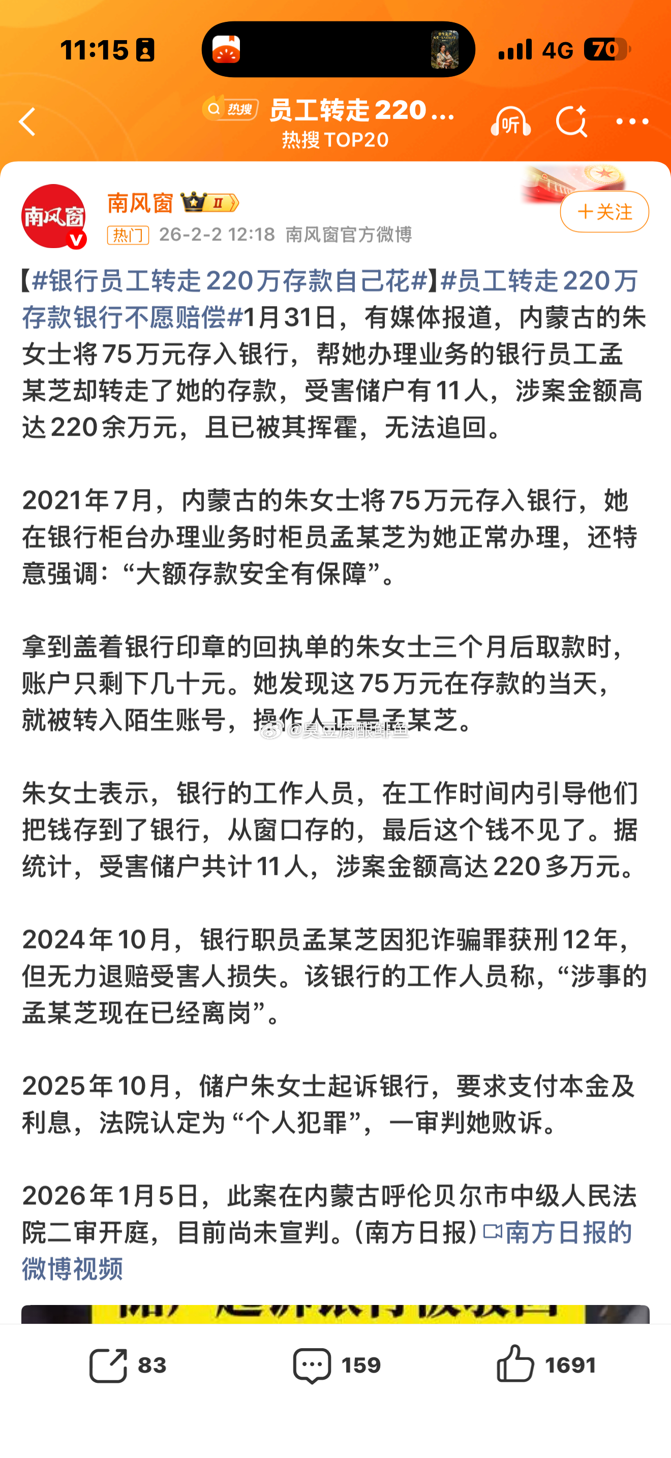 银行员工转走220万存款自己花弱势群体是银行,个人已经被判刑