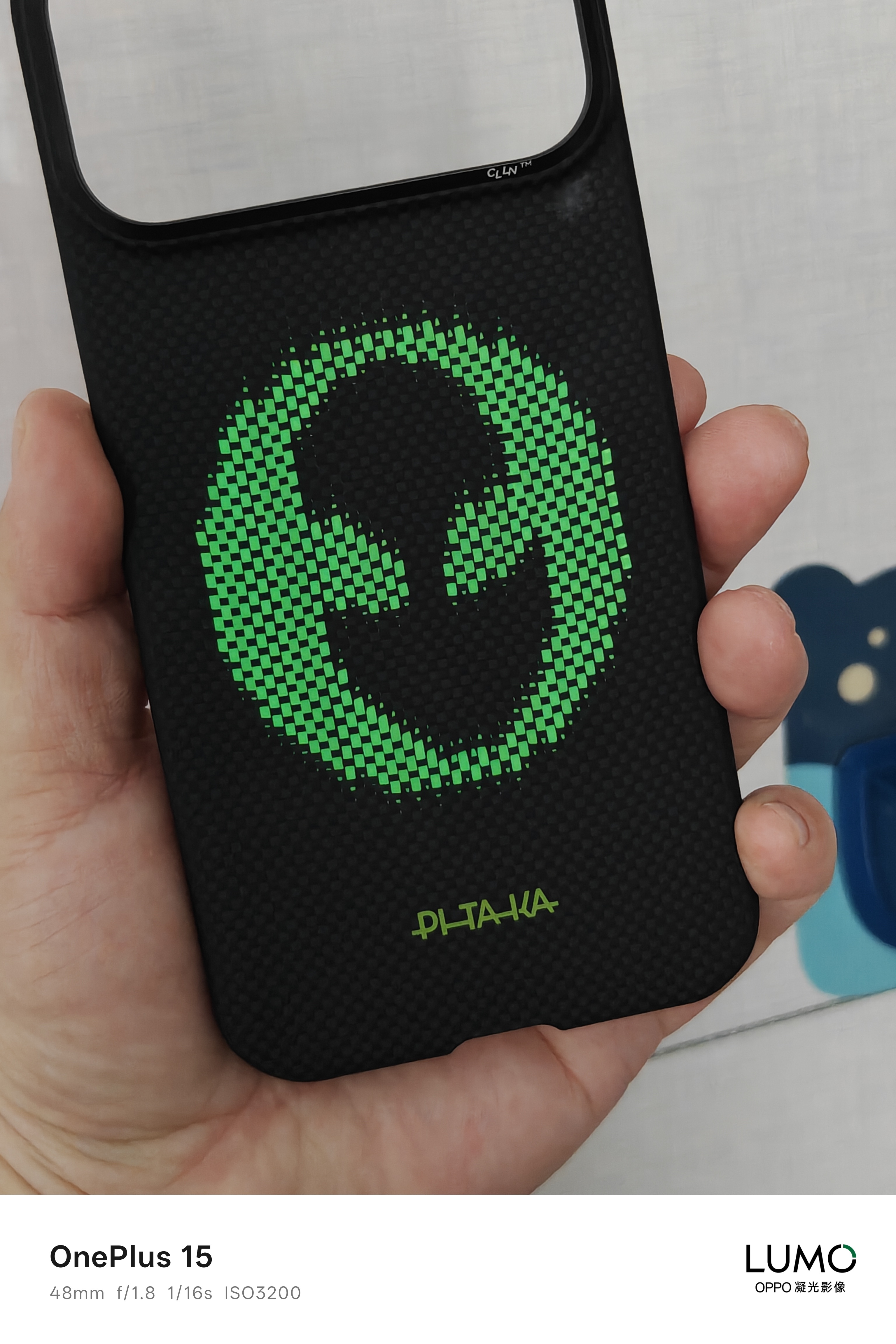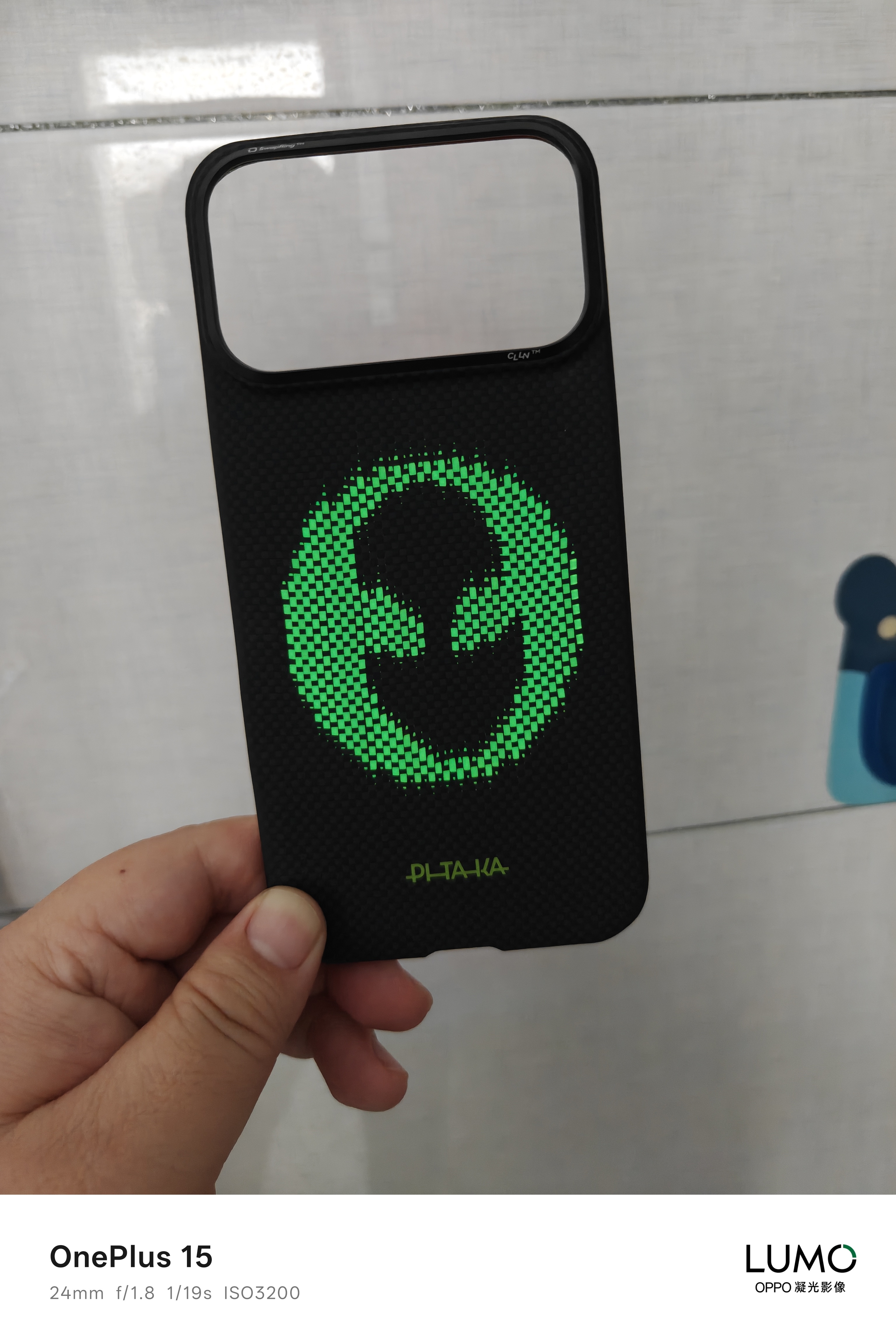 真会玩,这是PITAKA 推出的荧光手机壳,是与伦敦潮牌 Aries 联名设计的创新产品,核心亮点在于其采用首研材料 Lumintex™ 流荧纤维,将发光元素直接织入芳纶纤维纱线中,实现夜晚均匀发光的效果。这种荧光并非表面涂层或印刷,而是通过编织工艺融入材质内部,使光线柔和高级,兼具科技感与独特视觉效果。该系列发光壳支持 MagSafe 磁吸,并应用“琥珀磁衣”技术,磁圈内嵌不增厚,充电吸附稳固。壳体保持 PITAKA 标志性的轻薄特性,厚度约 1.26–1.36mm,重量在 22g 左右,手感亲肤、防滑耐磨,我这款是iPhone 17 Pro Max版本。