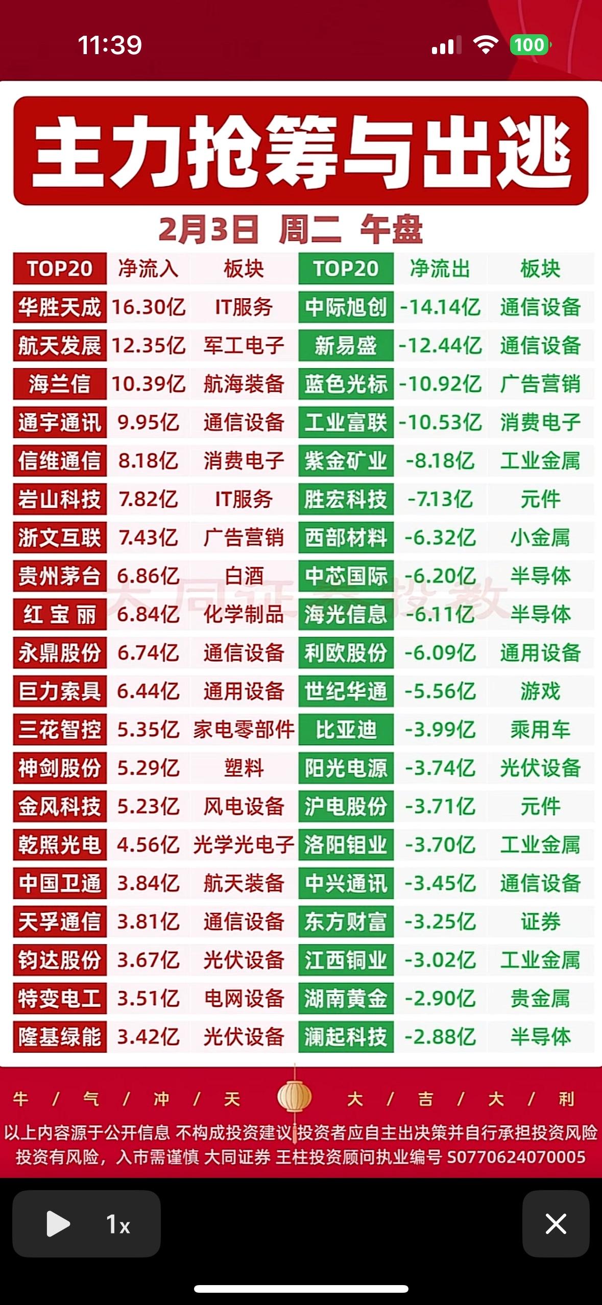 主力抢筹与出逃,今日板块动向一览 主力抢筹IT服务、军工电子,出逃通信设备、消费电子,板块资金分化明显。