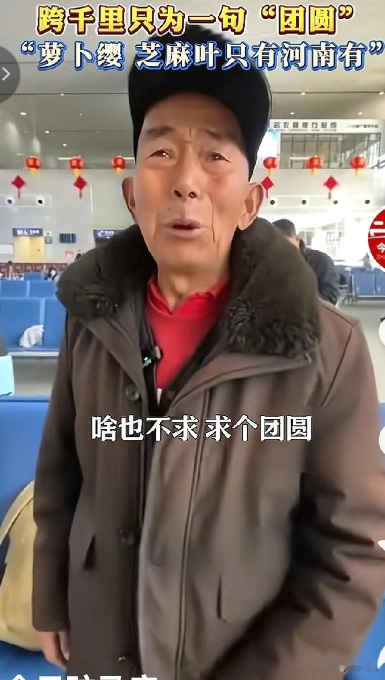 团圆,就是中国人春节的最大公约数,是写在每个人脸上的情感表达。 河南驻马店的这位老人背上四十斤的当地产蔬菜干菜,搭乘高铁反向去城市里,想和在外打工不能返乡的孩子们一起过个团圆年。 说不易的,似乎矫情,因为现在交通方便,说容易的,轻薄到了这份情感。 尤其是农村人出门在外还是有点不容易,当然比之以前有天壤之别。那时候坐火车钱也不一定买得到,车厢里横七竖八到处都是人和过年礼物,根本下不去脚。几天几夜往回赶过年的大有人在,现在旅程方便。 不过越是物质生活好了,精神需求就多了。能回到生养自己的家乡过个团圆年,仍然是很多人追求的。毕竟人在旅途,家是港湾。