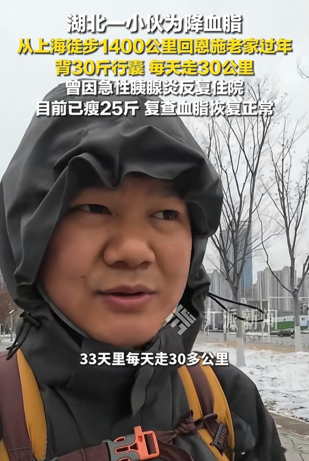 太拼了!湖北一小伙因身体不好,又查出有高血脂,医生建议他多运动,但小伙平时自制力差,不爱运动,于是小伙决定辞职,从上海徒步走回湖北老家,全程1400公里,强迫自己锻炼。 小伙1月1号从上海出发,计划一天大概走30多公里,这样40天就能到家,刚好能赶上过年。 小伙说,他每天只吃1顿饭,到第24天时,明显感觉自己身体状态变好了,他到医院检查时,发现已经减掉25斤,血脂等各项指标也正常了。 目前小伙已经到达湖北宜昌,预计再走4天就能到恩施老家,小伙说,虽然这趟旅程花了将近3000元,比坐车回家贵多了,但他主要是减肥,并不是为了省钱。 有网友说,小伙这趟旅程太值了,既收获了粉丝,又把他身体锻炼好,还省下车票钱。 还有网友说,小伙血脂是正常了,但膝盖肯定会磨损,以后要后悔的。 大家怎么看呢?