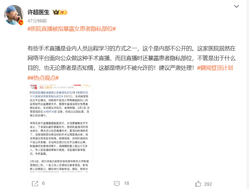 随后,对此评论称,有些手术直播是业内人员远程学习的方式之一,这个是内部不公开的。这家医院居然在网络平台面向公众做这种手术直播,而且直播时还暴露患者隐私部位,不管是出于什么目的,也无论患者是否知情,这都是绝对不被允许的!建议严肃处理!