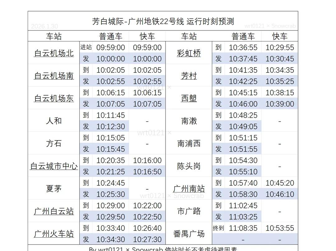 广州22号线及其互通段运行时刻预测 未来,广州22号线将和在建的芳白城际互联互通,设计最高时速为160km/h,芳白城际为省管铁路,即和广清城际、肇佛莞惠城际类似,且可能需以国铁命名规则命名,由广东城际运营。 我和 @Snowcrab💫 根据新线线路的走向、里程及配线等公开信息,一起推测出了18、22号线及其近期互通段的时刻表。 22号线及其互通段全程(白云机场北-番禺广场) 各停列车全程用时推测约68分钟,快车推测全程53分钟,白云机场北到广州白云站快车推测用时22分钟 22号线及其互通段快车站为:白云机场北/南/东、白云城市中心、广州白云站、广州火车站、彩虹桥、芳村、西塱、广州南站、番禺广场共计11座车站。据公开文件,因具备越行条件,市广路初步设计不为快车站。 我们根据目前18/22号线已开通部分的车站停靠时间,将客流较大及交通枢纽车站停靠设定为50秒,将可以换乘但客流较小或客流中等的非换乘站停靠时间设定为45秒,其余车站为40秒。始发站与终点站停靠时间为60秒。此外,车站避让停靠时长一般为150秒。值得注意的是,新款佳都屏蔽门支持该区间最大速度飞站。 图一的拓扑走向图参考了其他城市地铁与城际贯通的线路编号方式。请注意,该走向图未画出显性或隐性的预留站,如细沥、横门或应湖站,但预留了车站编号。 22号线及其互通段的预测运行时刻可翻阅 @Snowcrab💫 以上内容仅为根据公开资料和相关信息做出的预测值,不考虑待避等特殊因素。实际运行交路、运行时间、快车停靠站与车站站名请等以正式发布为准。 地铁 轨道交通 广州地铁 广东城际 广州