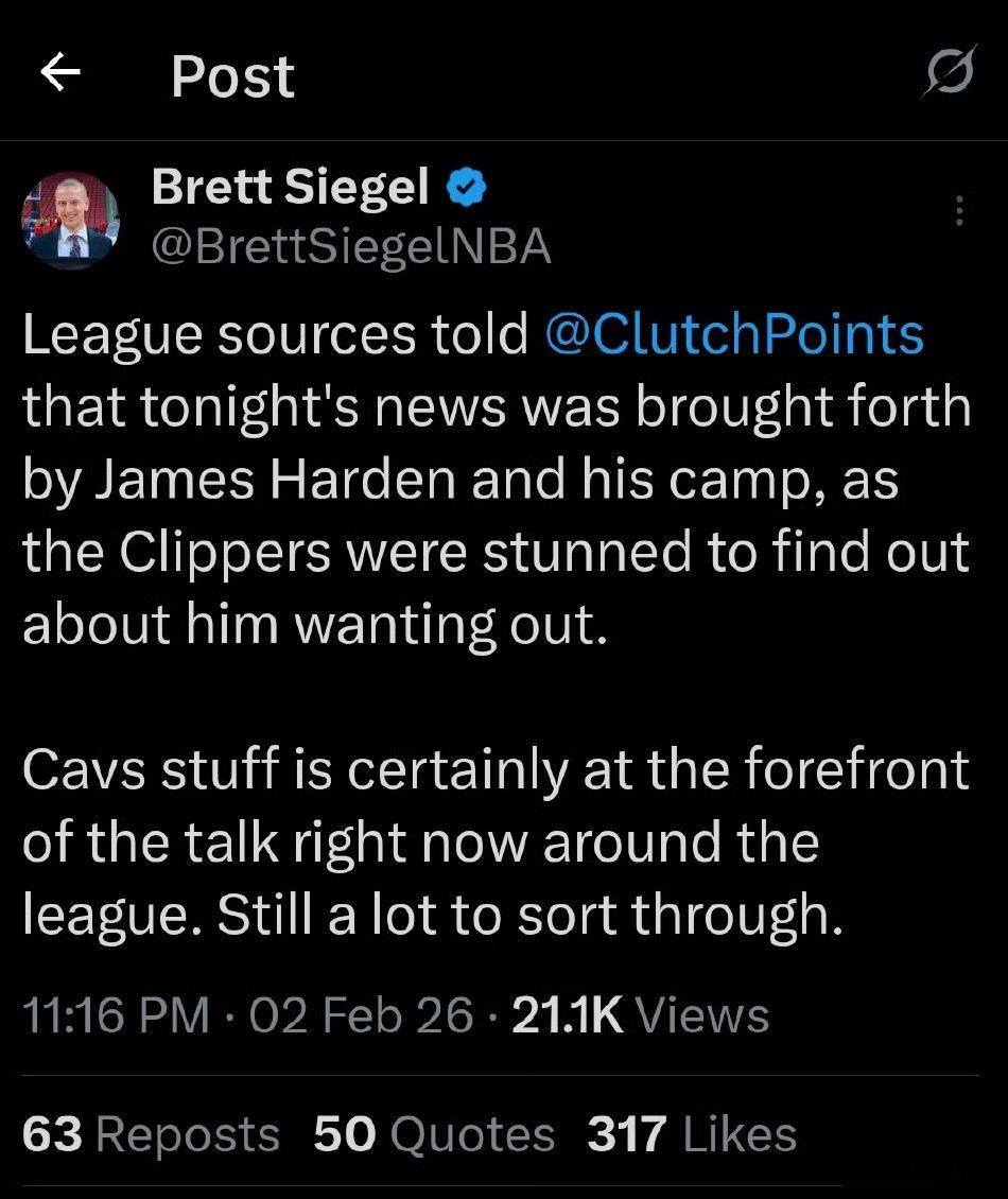 联盟消息人士透露,今晚这条消息其实是詹姆斯·哈登本人及其团队主动放出来的,快船方面刚得知时,对他提出想要离队的想法感到非常震惊。消息源明确提到:哈登和 快船已经就“分手”讨论了数周,并非临时起意。