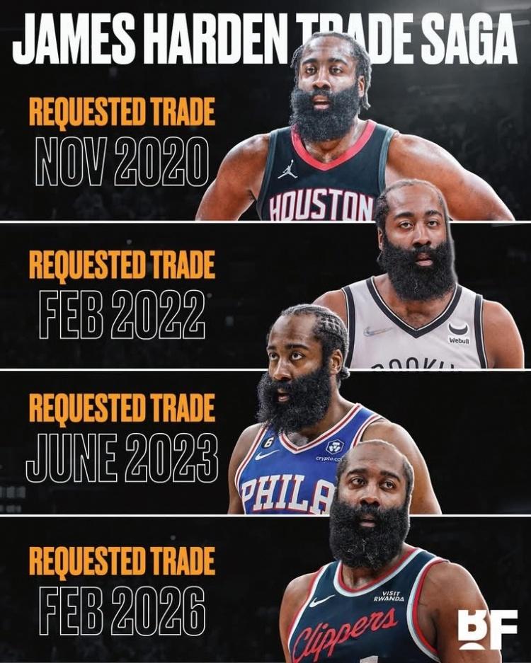 美媒嘲讽哈登四次申请交易:这哥们在哪都不开心! 2020:火箭→篮网 2022:篮网→76人 2023:76人→快船 2026:快船→? 从篮网开始到76人再到快船,确实有一些客观因素,欧文,恩比德,小卡,乔治,各自都有各自的问题,但哈登去哪儿哪儿大环境不好,也着实是巧合了一些。 现在试想一下,如果哈登还留在火箭,或许生涯会有不一样的精彩,至少休斯顿会成为哈登最坚实的后盾,他即便没有夺冠,在这座城市也会成为传奇。