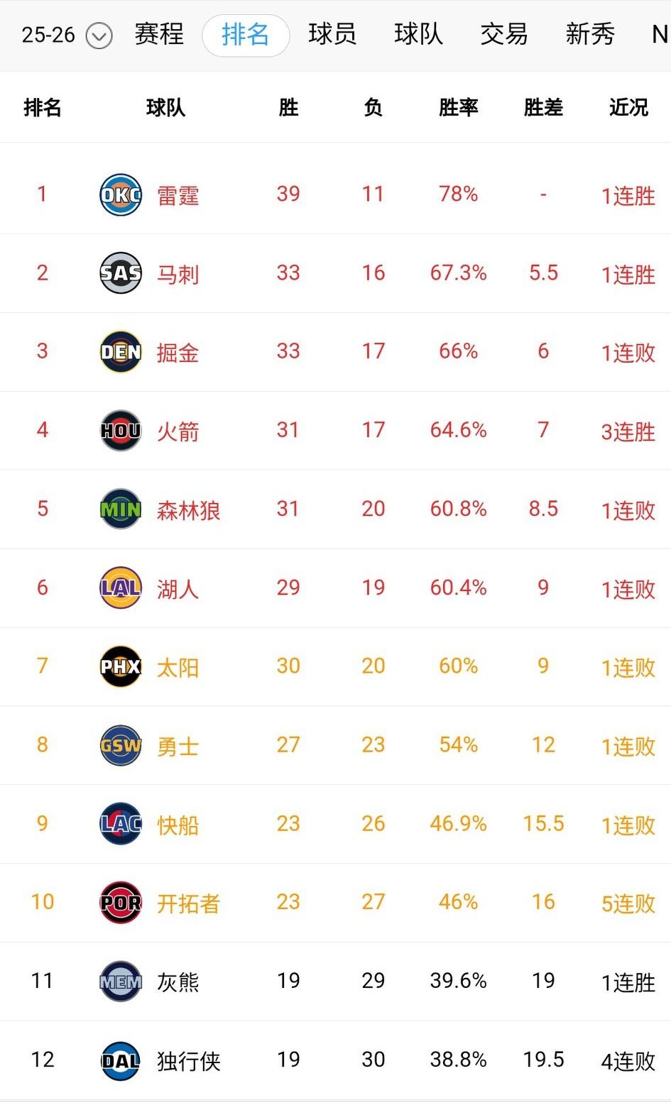 联盟无弱旅,火箭险胜步行者排名依旧第四,距离第三只有一个胜场差了。森林狼爆冷不敌灰熊排名第五,没有比赛的湖人躺在第六。 快船主场输给76人,排名依然第9,大概受哈登交易影响,快船打算放弃了。 西部的剧本这几年都很有意思: 22-23赛季 雷霆西部第10 23-24赛季 雷霆西部第1 23-24赛季 火箭西部第11 24-25赛季 火箭西部第2 24-25赛季 马刺西部第13 25-26赛季 马刺目前西部第2 看来独行侠大概率也会走这样的重建路线。独行侠今年排名稳居第12。