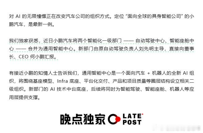 小鹏汽车再次重大调整!将自动驾驶和智能座舱中心合并,新成立通用智能中心。新部门由