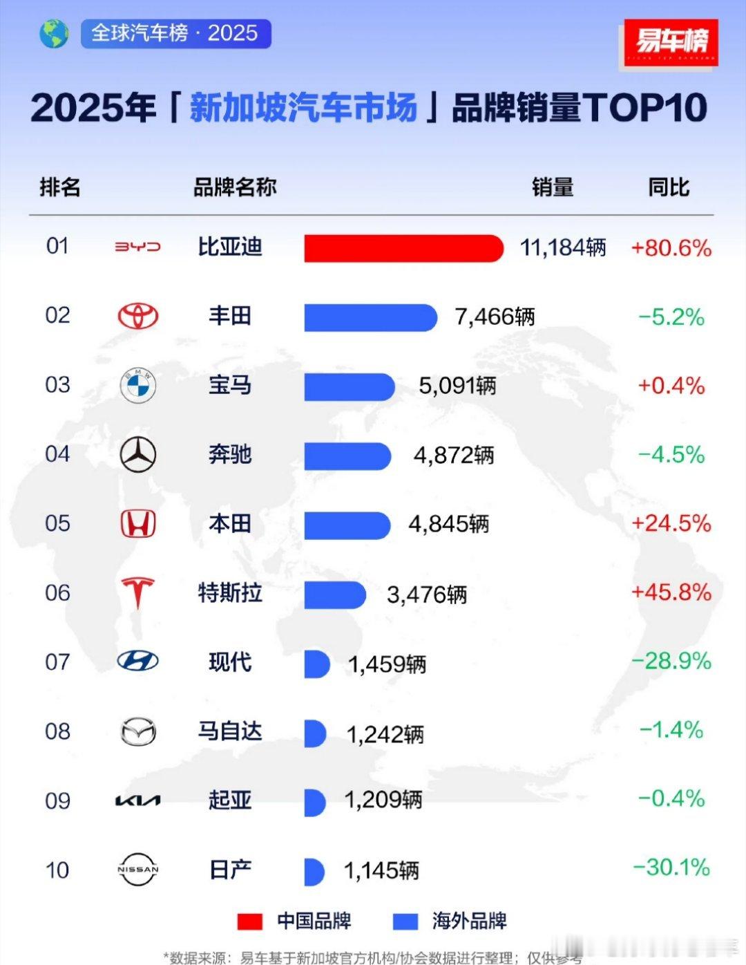 比亚迪拿下新加坡年度销冠 比亚迪2025年12 月销量 1561 台,创历史新高,全年累计 11184 台、市占率 21.2%,断档式领先丰田、宝马等品牌拿下年度销冠,更是当地唯一年销破万的汽车品牌。比亚迪丰田