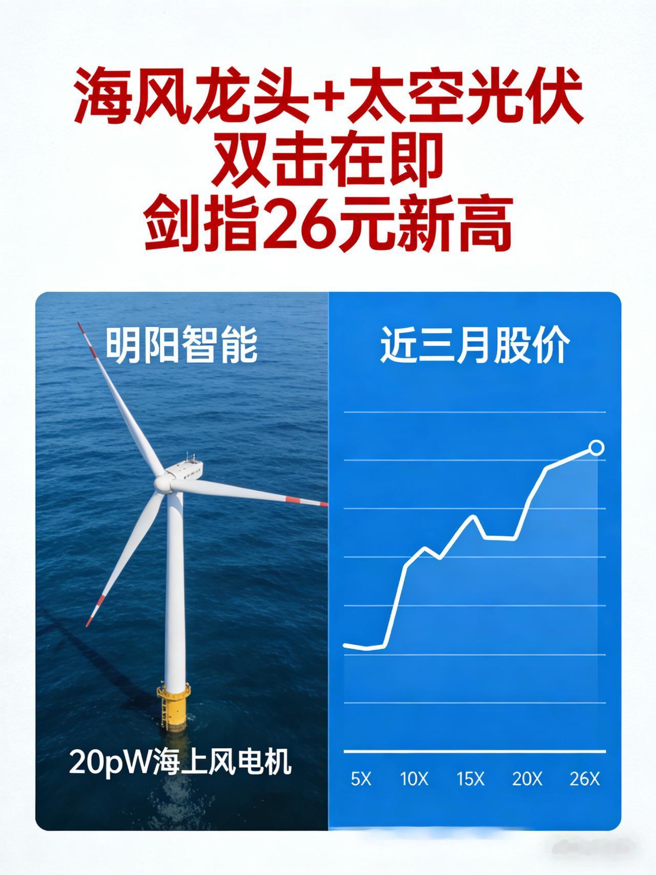 浮式风电龙头明阳智能26.08元新高已破!风电+太空光伏双击彻底起飞🚀 🔥 最新行情直击(2月3日):盘中最高26.08元,突破前高!现价25.84元,单日暴涨8.30%,成交额37.51亿,换手率6.71%,主力资金疯狂扫货,新高之后还有新高? ✅ 王牌1:百亿订单+业绩预喜,基本面硬到没朋友 作为国内海风装机量第一龙头,明阳智能刚放两大王炸: 1. 2025年净利润大幅增长,毛利率显著改善,海风规模化交付+陆风升级+海外拓展三驾马车齐发力; 2. 中标超百亿元国内海风大单,叠加越南6GW能源集群项目签约,2026年业绩基本盘直接锁死; 3. Q1盈利拐点明确!海风帆石二、青洲七项目密集交付,海外出货同比翻倍,全年海风交付剑指4GW,业绩增速要爆表 ✅ 王牌2:技术垄断+赛道唯一,3-5年无对手 这才是明阳最核心的护城河,别人根本抄不动: ✅ 全球单机最大18-20MW海风机组已投运,漂浮式风电市占率超35%,16.6MW“明阳天成号”抗17级台风,技术代差3-5年; ✅ 50MW超大型机组降本60%+,度电成本低至0.28元,商业化提前5年落地,深远海风电直接被它颠覆; ✅ 收购德华芯片切入太空光伏,卡位商业航天风口!2026年卫星订单超600颗,营收15亿+,毛利率45%-55%,第二增长曲线彻底打开 ✅ 王牌3:估值严重低估,目标价看30元+ 当前市值仅540亿,机构给出800-1000亿合理估值,还有50%-85%上涨空间! ✅ 2026年归母净利预计28亿,对应PE仅14倍,对比陆风龙头30倍PE,海风龙头估值严重错杀; ✅ 分部估值测算:海风主业+太空光伏+储能氢能+海外业务,单业务估值都能撑起当前市值,多赛道共振下估值必重塑 ✅ 王牌4:资金+政策双加持,上涨趋势挡不住 1. 资金面:今日成交额37.51亿,换手率6.71%,主力资金持续净流入,筹码充分换手后上涨更有动力; 2. 政策面:国内海风装机加速,海外欧洲+东南亚需求爆发,英国142亿全产业链基地落地,海外收入占比将破40%,毛利率比国内高5-8个点; 3. 趋势面:近三月涨幅超70%,今日突破前高26.03元,创下26.08元历史新高,上升通道彻底打开 💡 逆向操作策略(别人恐慌我贪婪) ✅ 持股者:坚定持有,突破26.08元新高后,目标价看30元,止损位24元(跌破5日线果断离场); ✅ 观望者:回调至25元下方分批低吸,分3笔建仓(30%+40%+30%),不追高不重仓,把控仓位风险 ⚠️ 【免责声明】 本文内容仅为非专业人士个人见解,基于公开行情数据、公司公告及券商研报整理所得,不向任何人推荐任何个股,不构成任何投资建议、投资引导及收益承诺。股市波动风险极大,个股走势受行业政策、市场情绪、资金流向、突发事件等多重因素影响,过往业绩不代表未来表现。投资者需结合自身风险承受能力,独立判断、自主决策,理性投资,盈亏自负。 明阳智能 风电龙头 太空光伏 A股 新能源投资 商业航天