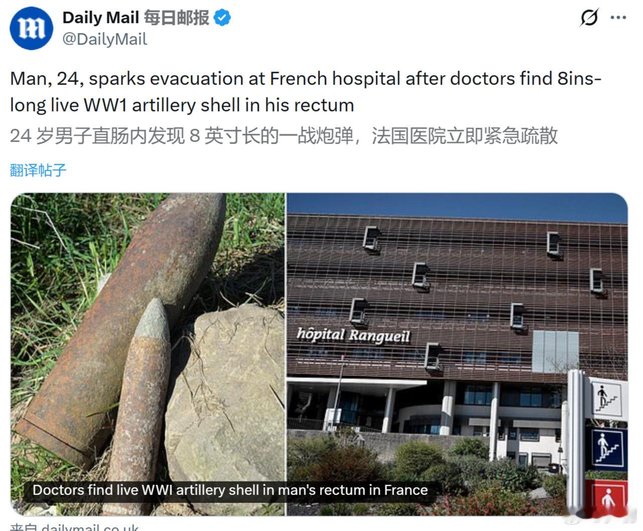 《每日邮报》:法国一名24岁男子,因为腹痛住进住进医院,医生在他的直肠内发现一枚8英寸长的第一次世界大战未爆炮弹,引发医院紧急疏散。但这并非法国首次出现此类案件。2022 年,一名 88 岁的法国老人被送往医院,他的臀部卡着一枚第一次世界大战遗留的炸弹,这让医生们大吃一惊。这TM都是什么阴间新闻。海外新鲜事法国一男子直肠内发现8英寸长的一战未爆弹