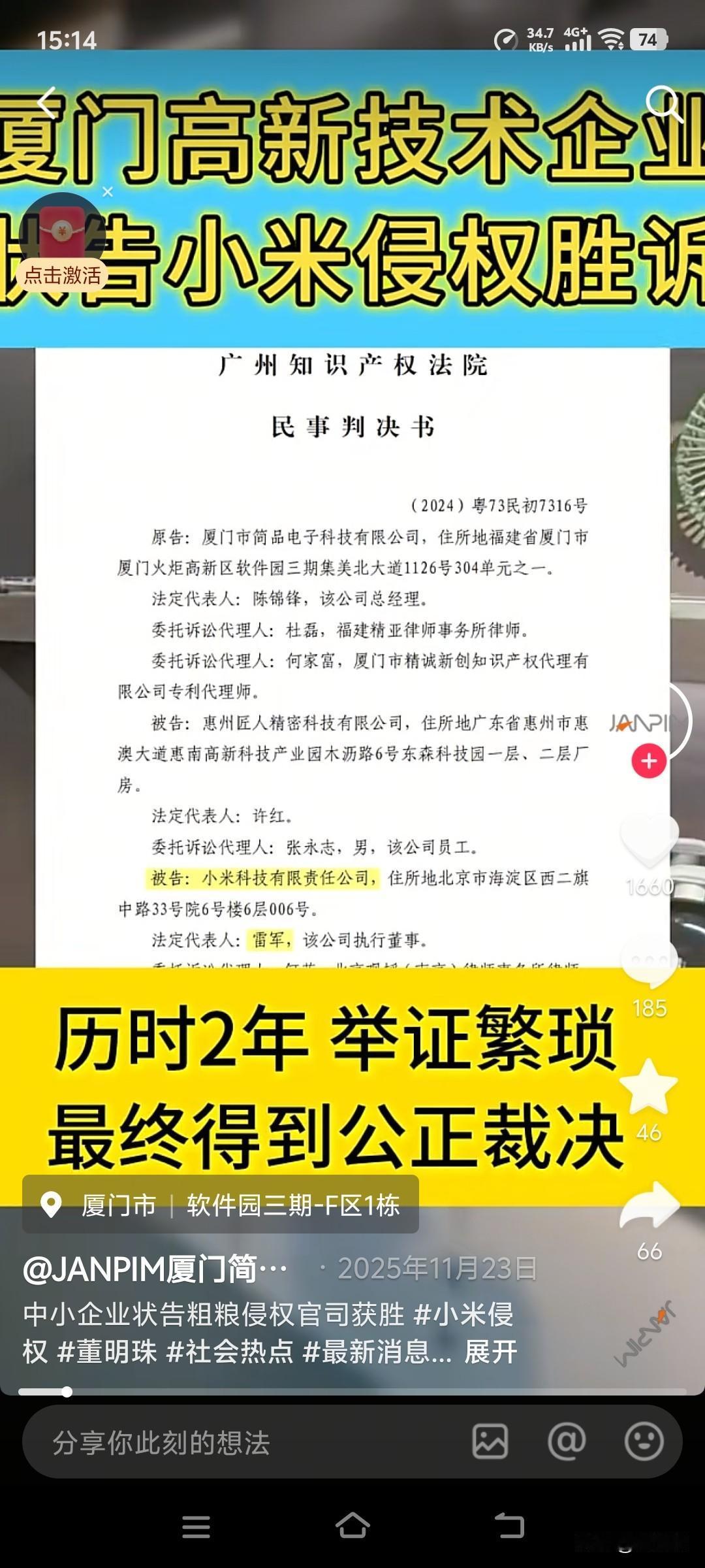 厦门简品科技起诉小米公司抄袭胜诉! 一家12人的小公司硬刚一家500强企业胜诉