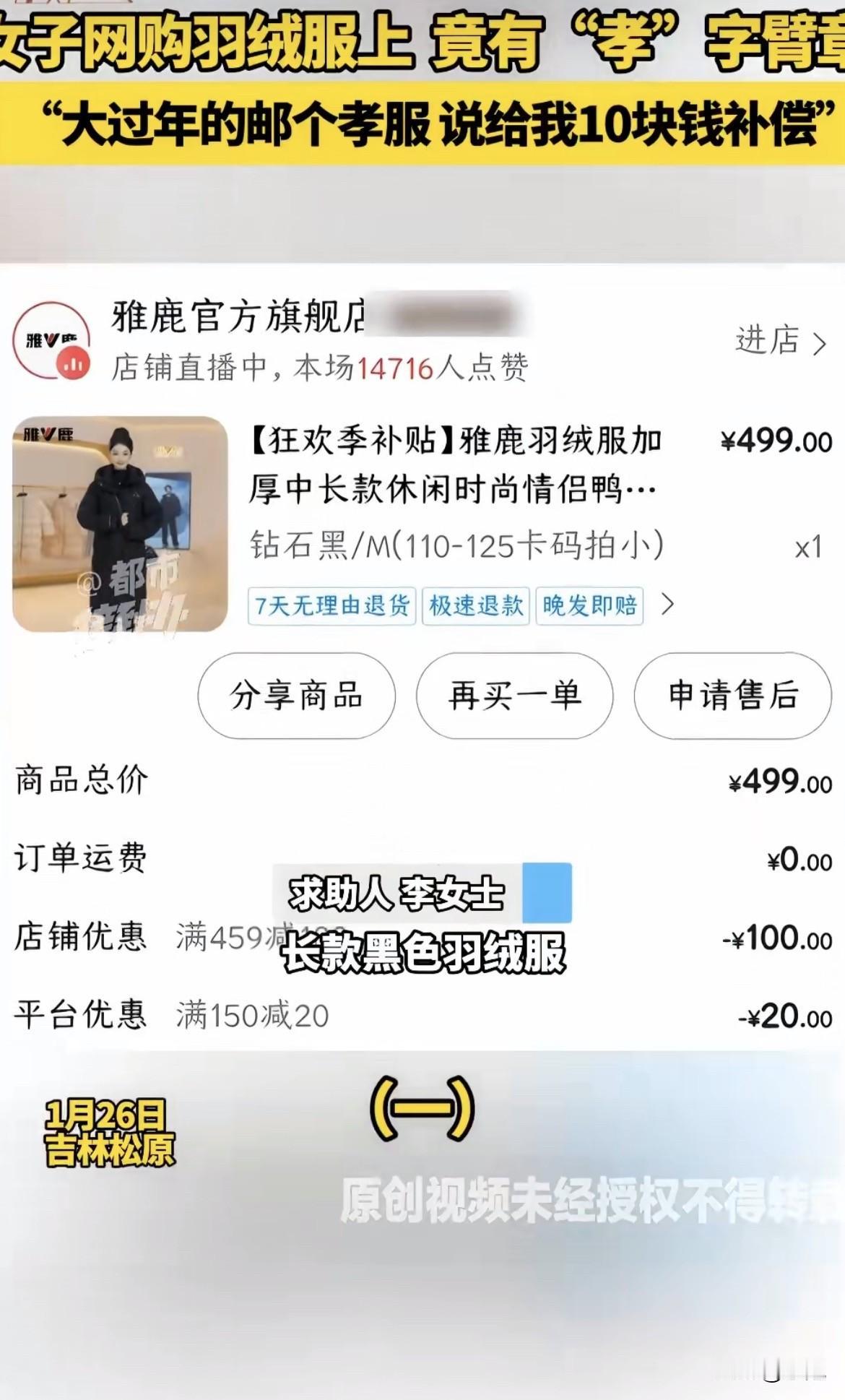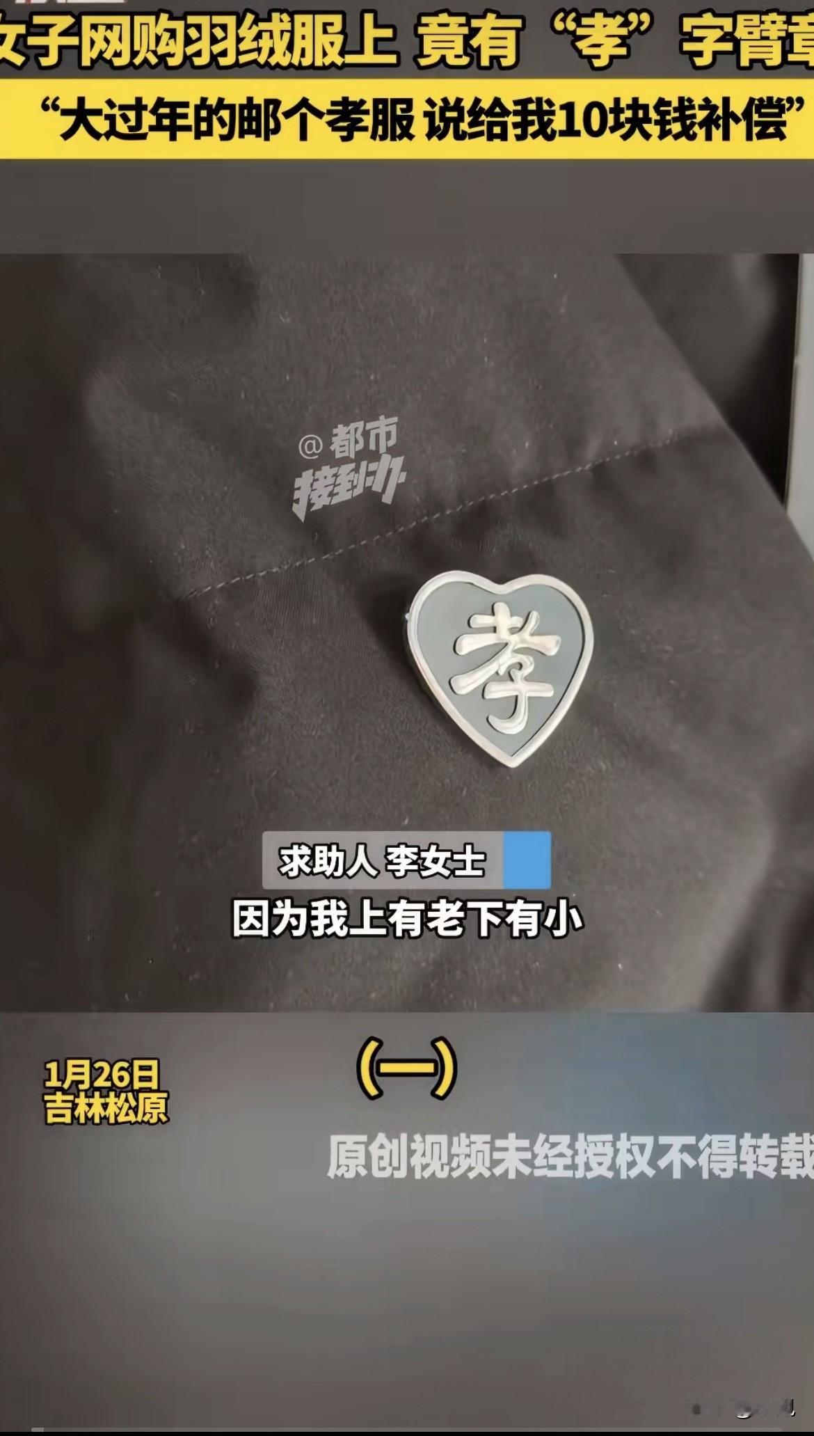 真是离了大谱!网购一件过年穿的新羽绒服,拆开一看袖子上竟别着个醒目的“孝”字臂章,这晦气谁受得了? 吉林的李女士,年前在网上买了件黑色羽绒服,就等着过年穿新衣喜庆喜庆。快递一到,她满心欢喜拆开包装,拿出衣服这么一检查,心当场就凉了半截。 衣服右边袖子上,别着个塑料臂章,上面清清楚楚印着一个“孝”字。在中国人的讲究里,这玩意儿是办丧事时佩戴的孝标。大过年的,看到这么个东西贴在给自己买的新衣服上,李女士感觉像吃了苍蝇一样恶心。她气得手都哆嗦,第一反应就是:这绝对不是件新衣服,八成是别人穿过了又退回去的,商家没检查,转头就又卖给她了。 这事儿搁谁身上都气炸,李女士立马拍了照片,找店铺客服对质。 客服那边的反应,也挺有意思。一开始,客服给的说法是:“应该是打包的时候不小心弄上的。”这话听着就有点扯,打包怎么能专门打包进去一个“孝”字臂章呢?紧接着,客服抛出了处理方案:衣服可以退换,另外再补偿10块钱。 10块钱。这个数字一出来,李女士心头的火更旺了。她觉得这根本不是钱的问题,而是对方的态度问题,是拿10块钱在糊弄她,轻视她收到这种东西的感受。她当然不接受。 一看李女士不买账,客服的态度来了个急转弯。之前还承认可能是“打包问题”,现在改口了,坚决否认。他们一口咬定,发货前都会仔细检查,商品绝对不可能有这种贴花。 这下李女士更不干了。说法前后矛盾,让人怎么相信?她直接提出了一个硬核要求:要看商家打包这件衣服时的监控视频。她要亲眼看看,这衣服发出来的时候,到底干不干净。商家那边呢,嘴上说着会尽快安排,但这个“尽快”是多久,谁也不知道。 事情僵在这儿,李女士干脆投诉到了购物平台,让平台官方介入处理。现在,平台已经介入了,正在调查,就等着看商家能不能拿出有力的证据来证明自己。 这件事,商家觉得自己可能也挺冤。他们或许真觉得是前一个买家试穿后别上去的,退货时没摘,自己收货时又没检查出来。二次销售退货商品,在电商行业里不算稀奇事,但他们的疏漏在于,没有一道严格的检查流程来保证商品的“全新”状态。 而站在李女士的角度,这完全是无妄之灾。她花的是一手新衣的钱,凭什么要接收一件带着他人使用痕迹、尤其是这种极端晦气痕迹的“二手货”?客服那种轻描淡写、试图用10块钱了事的态度,更是对她情感伤害的漠视。 更让人心里不是滋味的是,有网友翻出了旧闻:去年12月,武汉一位陈女士遇到了几乎一模一样的事,她网购的羽绒服上也别着“孝”字臂章。而那次,商家最终赔偿了6000元。 同样是令人膈应的“孝”字臂章,一个赔10元,一个赔6000元,这中间的差距,恐怕不只是钱,更是对待消费者遭遇的态度和诚意。 你觉得,李女士要求查看监控过分吗?面对这种问题,商家赔10元算有诚意吗?如果你是李女士,你会怎么做?