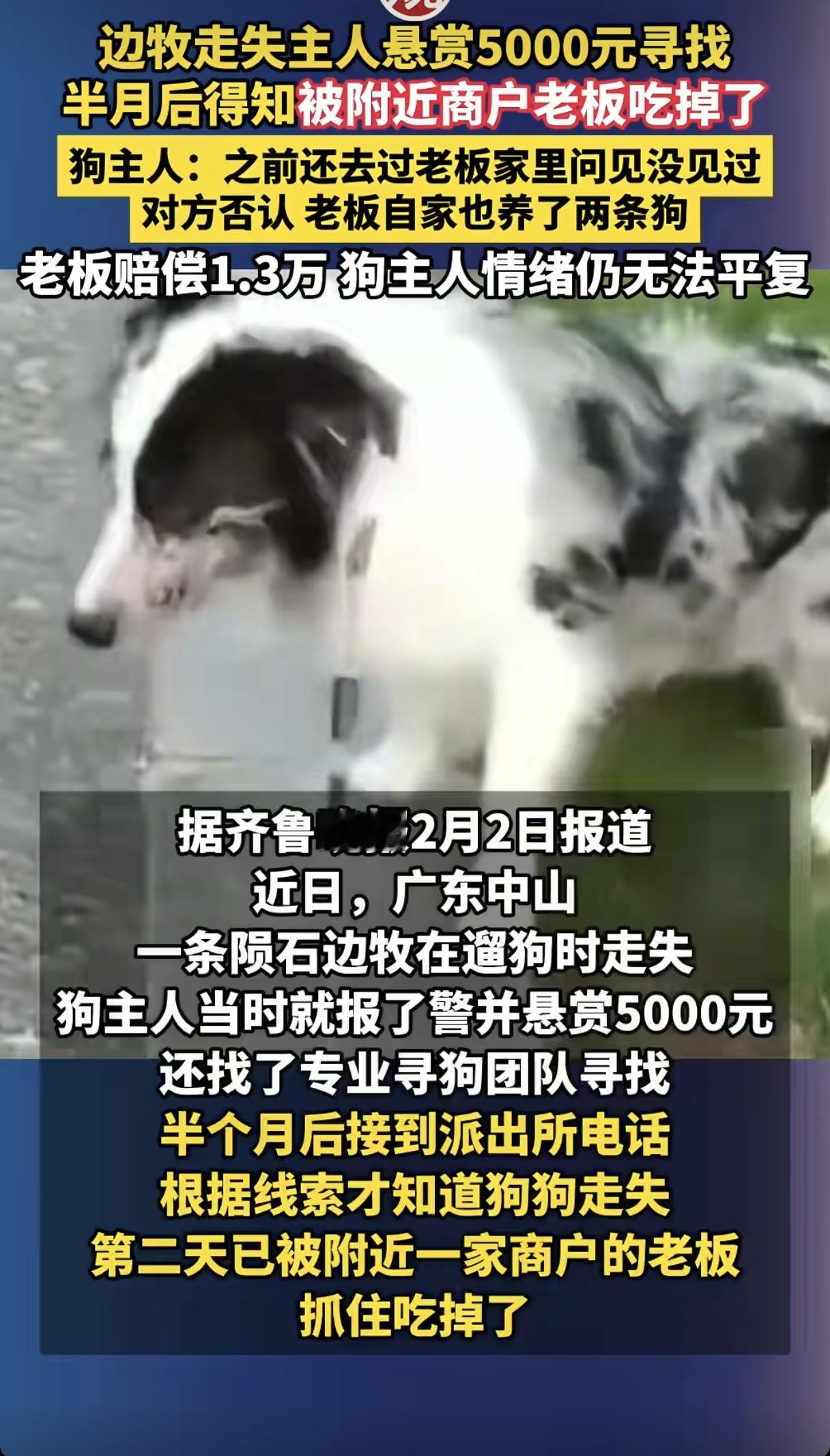 陨石牧赔走丢半个月后,报警调监控发现,1月12日狗狗走进一家店铺,13日早上狗狗就被sha害变成了一盘菜。更令人痛心的是,这位店主自己也养了两条狗,寻找期间,主人还去这家商户打听过狗的下落,但对方隐瞒真相,误导了寻找方向。 狗狗在遛狗时走失,主人当时就报了警,并悬赏5000元寻找,还找了专业寻狗团队一起搜寻。 半个月后却接到派出所电话,才知道狗狗丢失第二天就被附近一家商户的老板抓住吃掉了。 店主老板也承认了,随后双方签订了协议,店主赔偿主人13000元,但狗主人的情绪依然沉浸在巨大的悲痛之中。 边牧特别聪明,尤其是陨石边牧,而且那个商户自己也养狗,是怎么忍心的?想吃狗肉可以去狗肉馆,也花不了多少钱! 养狗不只是精神陪伴,还能提供情绪价值,养这么大也花费不少精力和金钱,明明知道主人在找狗,还故意隐瞒真相,确实太缺德了!