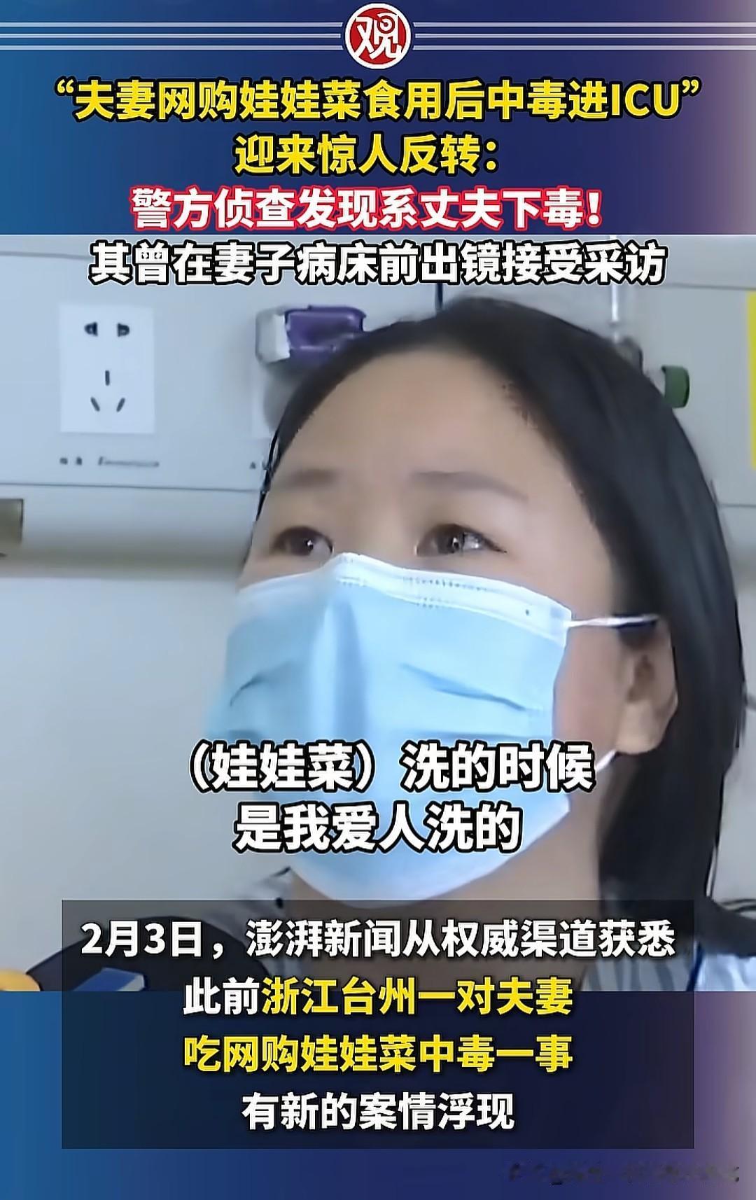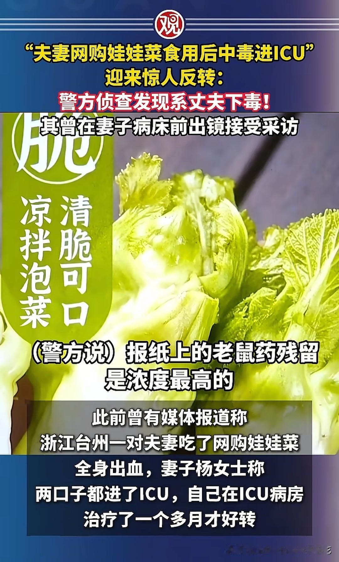 店家投毒本身就是天大的笑话,哪个店家会做这么蠢的事,除非店家想不开。浙江台州夫妻网购蔬菜中毒事件,第一个排除嫌疑的就是店家,因为别人购买的蔬菜平安无事,只有一家出了问题。商家很倒霉,杨女士也很单纯,唯独她的丈夫有点慌,他不是担心妻子的生命安危,而是事情进展跟自己想的不一样。 从早期的采访来看,男的眼神飘忽,演技堪比许国利。正常人的反应应该是担惊受怕,是愤怒,要为自己讨回公道,而男的频繁眨眼,眼角不停的往上看,撒谎成性,心虚的不行。如果有人问他:“是不是你干的!”这种人会迅速否认,极力洗脱自己的嫌疑。 不得不说,商家真的是无妄之灾,遇到这种敢对老婆下毒手的狠角色也是倒了大霉。男的为什么下毒,目前官方没有给出调查结果,可能是想讹商家一笔,也可能是其他的原因,但无论哪种动机,这般阴险算计,终究逃不过法律的眼睛和严惩!