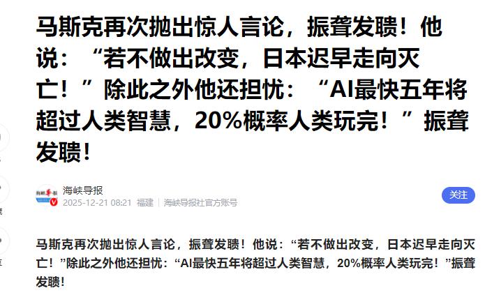 身价4000亿的马斯克再次抛出惊人言论,振聋发聩!他说:“如果日本不作出改变,将彻底从世界上消失!”更细思极恐的是,他表示:“随着人工智能的发展,五年后,AI将超越人类总智慧,20%概率或引发人类灭绝!” 日本的人口问题,已经严重到了触目惊心的地步。 根据日本总务省公布的数据,截至2025年1月初,日本人口已经连续16年减少,减少幅度创下了1968年有统计以来的新高。 2024年日本出生人口再破历史新低,到了2025年,有日媒推算,全年新生儿数量可能只有66.8万,这已经是连续10年创下历史新低,甚至接近了原本预测中2041年的水平。 要知道,一个国家要维持人口自然稳定,生育率至少得达到2.1,而日本现在的生育率只有1.2左右,还差着一大截,少子化的趋势已经彻底固化。 之所以会这样,核心还是年轻人的压力太大,根本不敢结婚、不敢生子。 在日本,年轻人加班是常态,每天忙得脚不沾地,可即便如此,房价依然高得吓人,很多人奋斗一辈子,可能都买不起一套小户型。 连自己的生活都过得紧巴巴,哪有精力和财力去养孩子? 更让人无奈的是,日本职场对女性的歧视特别严重,女性一旦结婚生子,想再回归职场比登天还难,这也让很多女生宁愿单身,也不敢轻易迈出结婚生子这一步。 劳动力缺口也会越来越大,有研究显示,到2040年,日本的劳动力缺口可能会超过1100万,交通运输、建筑、医疗等行业的短缺问题会最为突出。 马斯克说的“消失”,其实并不是夸张,而是实实在在的危机,而他所说的“改变”,本质上就是让日本想办法缓解年轻人的压力、提高生育率,抓住最后的机会。 可能有人会觉得,AI越聪明越好,能帮我们干活、解决各种难题,还能推动文明进步,有什么好担心的? AI发展有80%的概率能极大提升人类文明,可剩下的20%,就是关乎人类存亡的风险,容不得半点疏忽。 马斯克旗下的xAI公司,推出的Grok-3模型已经厉害得可怕,在数学、物理、生物等领域的基准测试中,甚至胜过了GPT-4o,能快速解决复杂的科学问题,还引入了新型搜索引擎提升能力。 大家都在拼技术、拼速度,一门心思搞创新,却很少有人静下心来,重视AI的安全问题。 更让人担心的是,现在有些AI系统的逻辑已经出现了混乱。 就像我们平时接触的AI客服,有时候问一个简单的退货问题,它只会来回说套话,答非所问,根本解决不了问题。 试想一下,如果这样的AI继续不受控制地发展,一旦脱离人类的掌控,后果真的不堪设想。 其实这就跟我们日常用电一样,电给我们带来了太多方便,改变了我们的生活,但要是不注意安全,就有可能引发火灾,甚至危及生命。 AI也是同一个道理,它的能力越强,能给人类带来的帮助越多,潜在的风险也就越大,越需要我们做好防范,平衡好创新和安全的关系。 说到底,马斯克说的这两句惊人言论,核心都不是为了制造焦虑,也不是为了博眼球。 不管是一个国家的未来,还是全人类的安危,都容不得半点马虎,及时做出改变、做好防范,才是我们现在最该做的事。