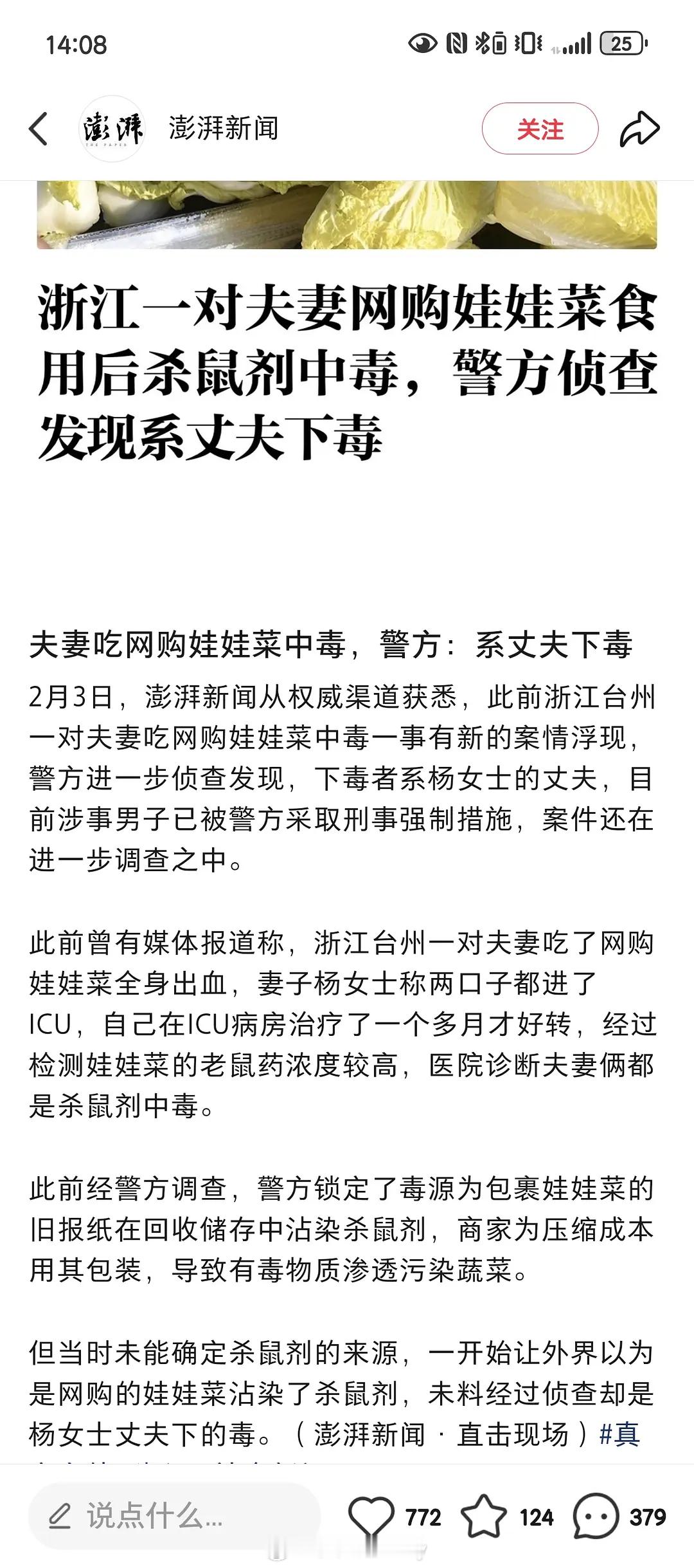 喔趣夫妻网购娃娃菜食用中毒系丈夫下毒