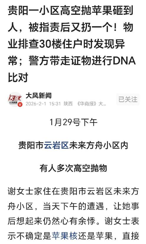 1月29日,贵州贵阳发生了一起令人震惊的高空抛物事件。谢女士在小区内散步时,突然