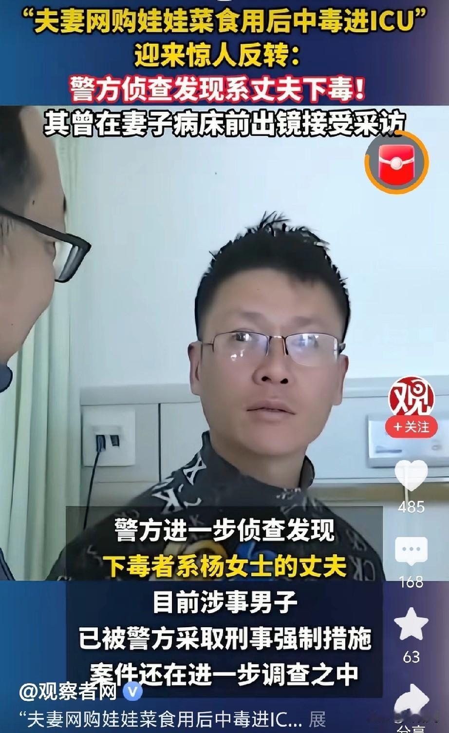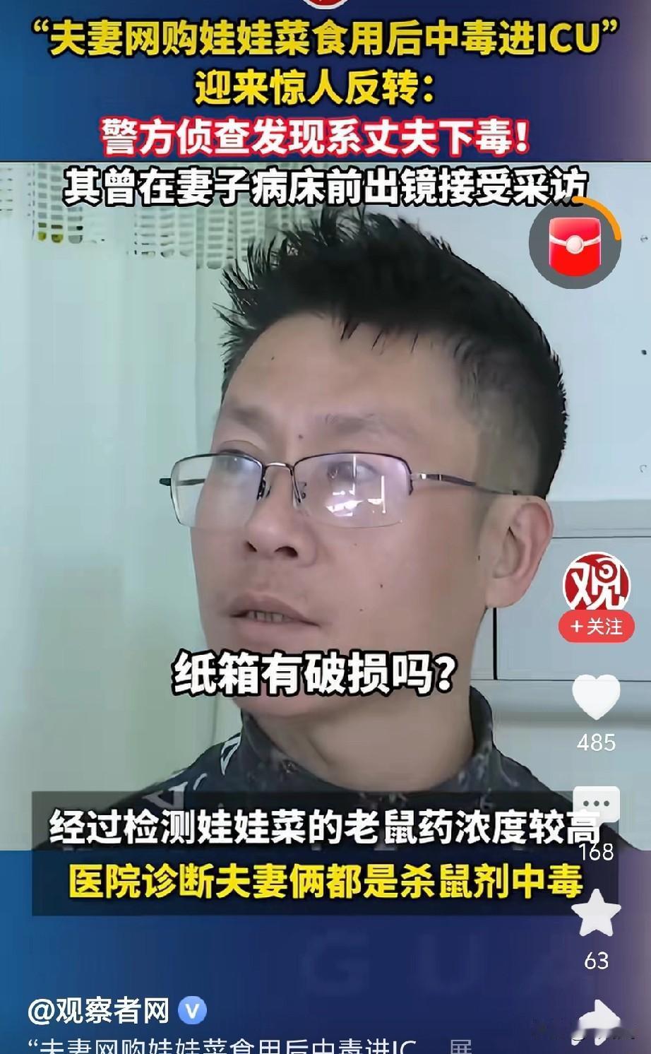 网购娃娃菜,食用后中毒住进ICU,惊人反转出现了。 原来是丈夫下毒,我早就说过,那丈夫面相阴冷,眼神闪躲,不过当时被骂得很惨。 现在好了,这下实锤了吧! 网购娃娃菜中毒,要是菜本身有问题,不可能只有他们夫妻俩出事。 这男人的面相跟杭州保姆纵火案的男主很像。