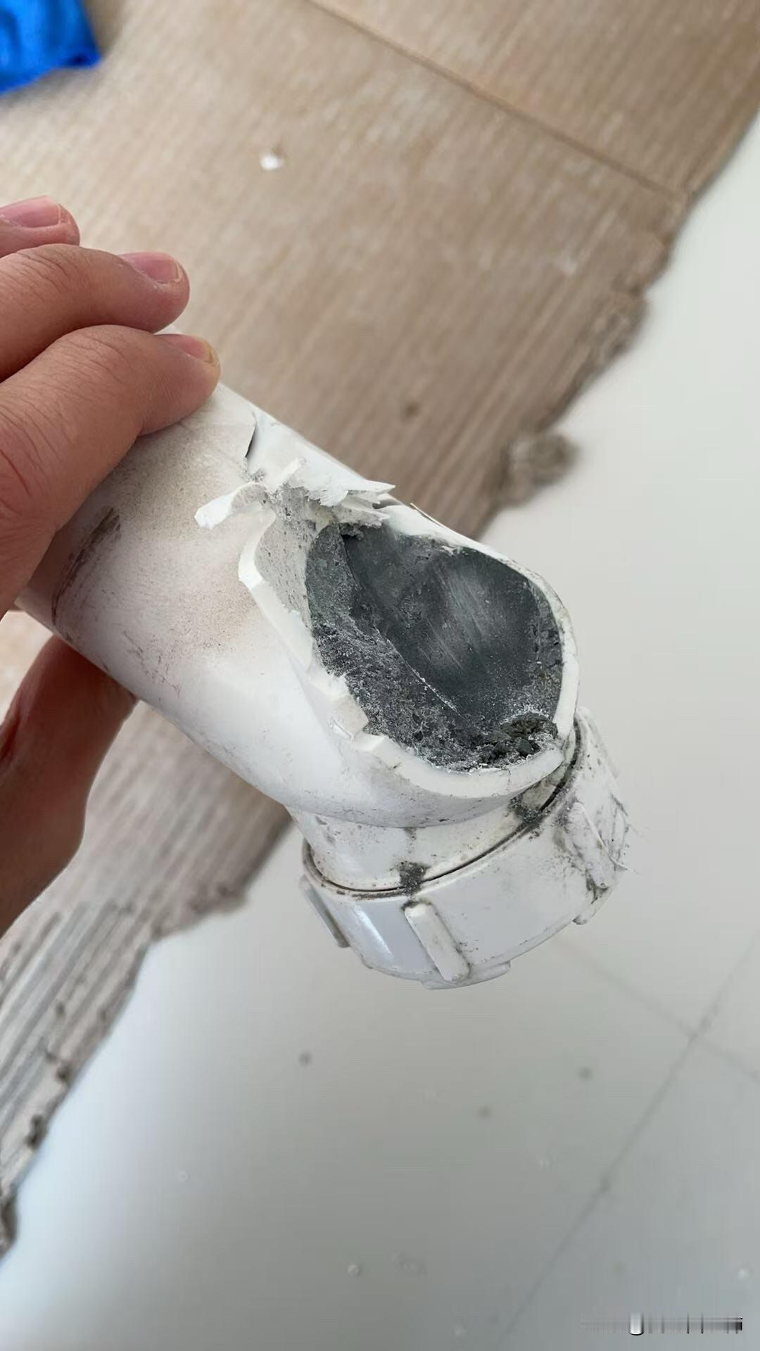 天塌了,地漏堵了 从来没想到装修会如此离谱。进卫浴后试水发现主卫浴室柜下方的地漏不下水。楼下的业主主卫改成衣帽间石膏板吊顶不愿意拆也没留检修口。装修公司找的两个师傅都没说堵的原因。 第二天只好自己找师傅,清理好直管,发现管道转弯处都是水泥,管子底部有缝隙,估计有水漏下去了,紧急联系楼下业主连夜拆石膏板吊顶。 第三天终于把存水弯的管子换了,切开真是大跌眼镜,水泥堵的严严实实。 为啥要买房,人生折磨