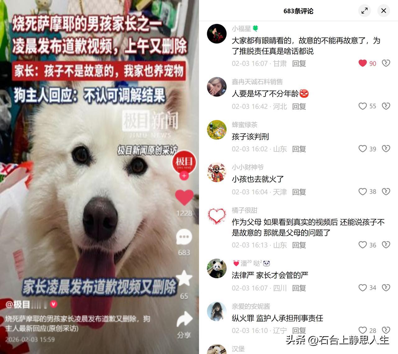 俩男孩烧狗,家长拿非故意甩锅 监控拍得透亮,俩孩子两次把点燃的烟花塞进狗笼,看着笼里的萨摩被烈火活活烧死,一人还在旁边追鸡嬉闹。事后家长凌晨发道歉视频转头就删,面对狗主人的不满,咬死孩子不是故意的,最后调解赔了六千块了事。 这事儿看着气人,就是当下不少人的惯用套路,出了错先拿非故意当挡箭牌。管你是有意还是无心,造成的伤害实打实。家长拿孩子小、不懂事当免死金牌,本质是不想直面自己的监护失职,把别人的痛处轻描淡写成意外。 这年头,非故意成了逃避责任的万能公式:碰坏东西说我不小心,伤了人说我没用力,说白了就是想赶紧甩锅,不想多担一点责任。可有些伤害,从来不是一句非故意就能抹平的。