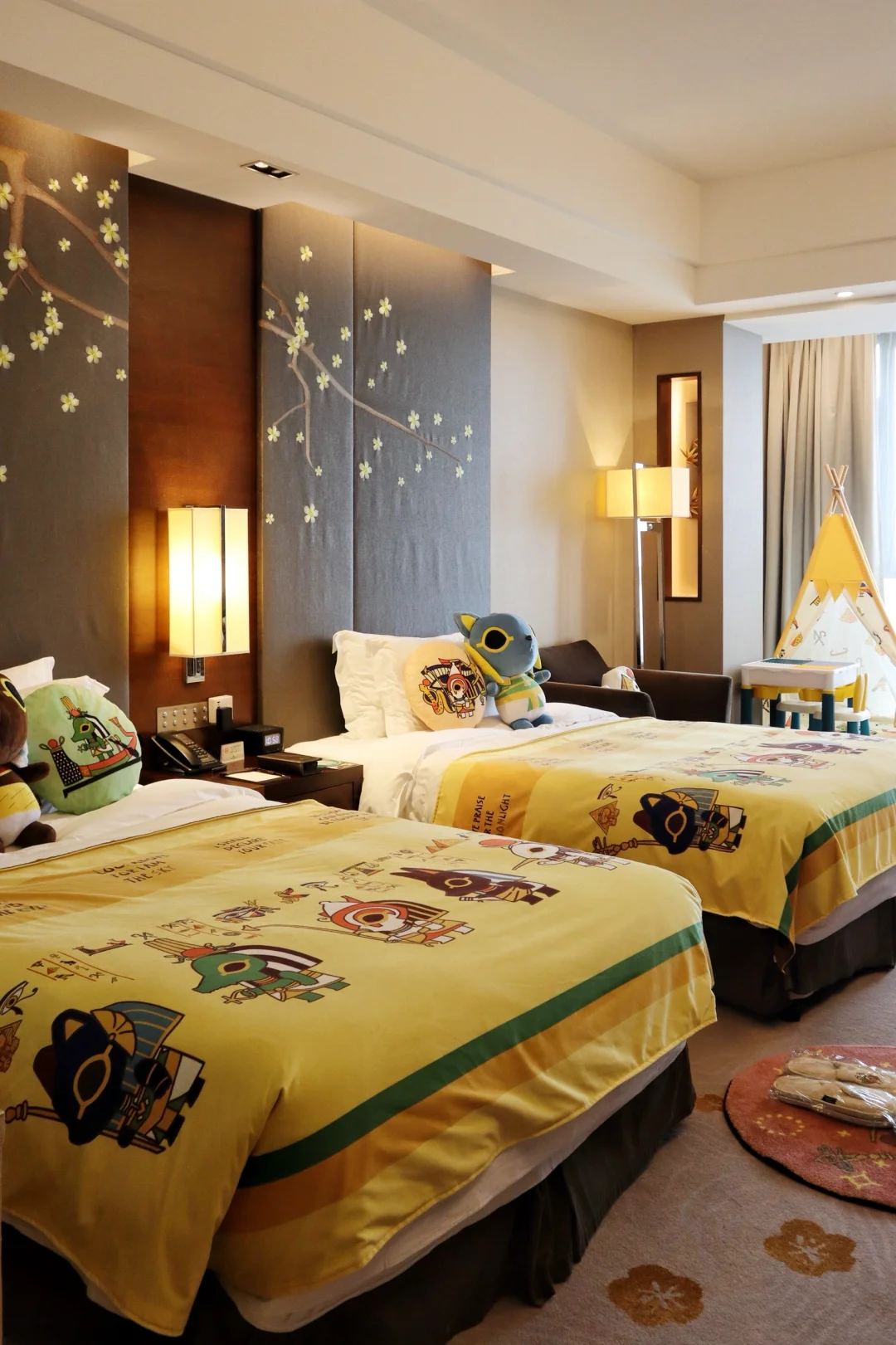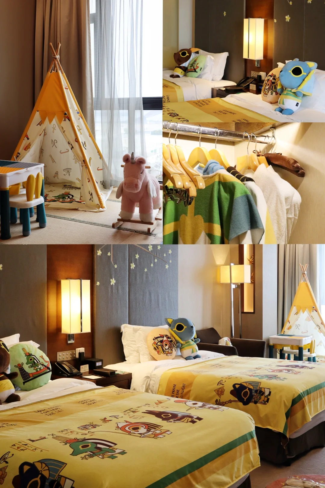 为了满足孩子住酒店🏨的小愿望,特意在周末选了家在环岛路附近,靠海的宝藏酒店,一边陪孩子,一边看潮起潮落。这次选的埃及萌神主题房,一进门就被童趣布置萌化~