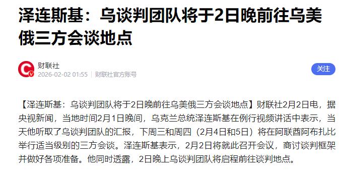 还真让我说着了!乌克兰总统泽连斯基官宣:2月1日的例行视频讲话中,他透露已听取乌谈判团队专项汇报,2月4日至5日,三方适当级别会谈将在阿联酋阿布扎比正式举行。 其实这场会谈早有苗头,1月下旬阿布扎比就已经进行过一轮三方安全工作组的非正式接触。 虽说那次没谈出实质性结果,但要知道,四年冲突下来,俄美乌三方能坐到同一间会议室里,本身就是打破僵局的重要信号。 这次泽连斯基正式官宣两天会谈,显然是上次试探后的进阶动作,也印证了之前外界判断的“外交破局窗口期”正在到来。 很多人好奇,为什么偏偏是阿布扎比?这背后的考量其实很现实。 阿联酋作为海湾地区的中立国,既没有跟西方绑定过深,也没有与俄罗斯交恶,这种不偏不倚的立场,能让三方都放下部分戒备,避免谈判一开始就陷入对立。 更关键的是,上次非正式接触已经在这里搭建了初步的沟通框架,各方对场地、流程都有了默契,继续选择这里能减少不必要的磨合成本。 更值得琢磨的是,这次三方会谈期间,乌美还特意安排了双边会谈环节。 泽连斯基高调宣称美乌安全保障文件已经“100%准备就绪”,就等在重建和经济合作上谈出结果,但事情显然没这么简单。 根据多方信源透露,美国的安全保障并非无条件给予,核心前提是乌克兰要同意与俄罗斯达成和平协议,而这其中大概率包含了从顿巴斯部分地区撤军的要求。 这对泽连斯基来说,简直是两难的抉择:之前他在新年讲话里刚表态“绝不接受乌克兰的领土被分割”,现在要是松口,国内民众的反对声浪肯定会铺天盖地,超过半数的乌克兰民众都明确反对任何领土让步;可要是不接受,美国的援助可能就会彻底断档,本就艰难的战场形势只会雪上加霜。 不过谈判能推进到这一步,也不是没有积极信号。 从1月30日开始,乌俄双方已经默认了“能源停火”,不再互相袭击对方的能源基础设施。泽连斯基说这是为了让民众更信任谈判,但其本质是双方都在释放缓和姿态。 打了四年仗,不管是乌克兰还是俄罗斯,民众都已经疲惫到了极点,持续的冲突只会带来更多消耗,没有任何一方能真正受益。 接下来的两天,阿布扎比注定会成为全球关注的焦点。 乌美之间的安全保障协议到底能不能谈拢?三方在停火机制、部队部署这些关键问题上会不会有突破?最核心的领土争议,会不会成为谈判桌上无法跨越的鸿沟? 这些问题的答案,不仅关乎俄乌两国的未来,也会影响整个欧洲乃至全球的安全格局。 对乌克兰民众来说,他们想要的只是不用再躲防空洞、不用再担心能源短缺的和平生活;对俄罗斯来说,更希望通过谈判巩固既得利益,实现“体面收兵”;而美国则想在自身利益最大化的前提下,给这场拖了四年的冲突画上一个对自己有利的句号。 其实不管最终结果如何,能让三方坐下来进行实质性磋商,本身就是一种进步。和平从来都不是靠一次谈判就能实现的,它需要反复的沟通、试探甚至妥协。 这场持续四年的冲突,已经让太多人失去了家园和亲人,不管是哪一方的胜利,都伴随着难以弥补的伤痛。 我们能做的,就是持续关注会谈的进展,期待各方能拿出足够的诚意和智慧,让这场漫长的冲突早日迎来真正体面的结束,让两国人民都能重新回归正常的生活。