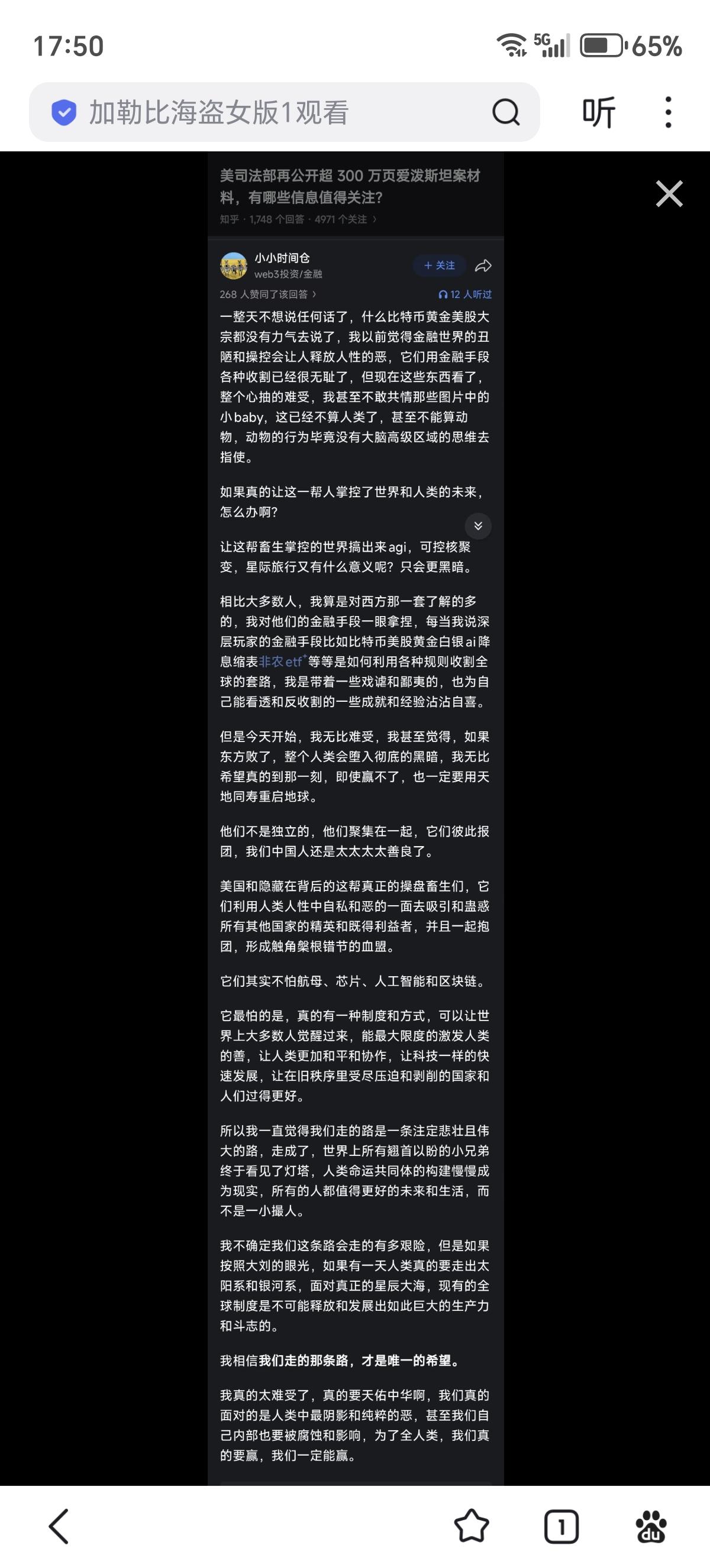 美司法部再公开超300万页爱泼斯坦案材料,有哪些信息值得关注? 这位网友说的很对,如果真的让这帮人掌控了世界和人类的未来,怎么办啊? 如果美国算是文明国家,那文明毫无意义。 美西方其实不怕航母、芯片、人工智能和区块链。 它最怕的是,真的有一种制度和方式,可以让世界上大多数人觉醒过来。 能最大限度的激发人类的善,让人类更加和平和协作,让科技一样的快速发展,让在旧秩序里受尽压迫和剥削的国家和人们过得更好。 所以,中国和美国的竞争不只是国家的竞争,也是文明的竞争,更是人类和魔鬼的竞争。 为了全人类,我们真的要赢,我们一定能赢