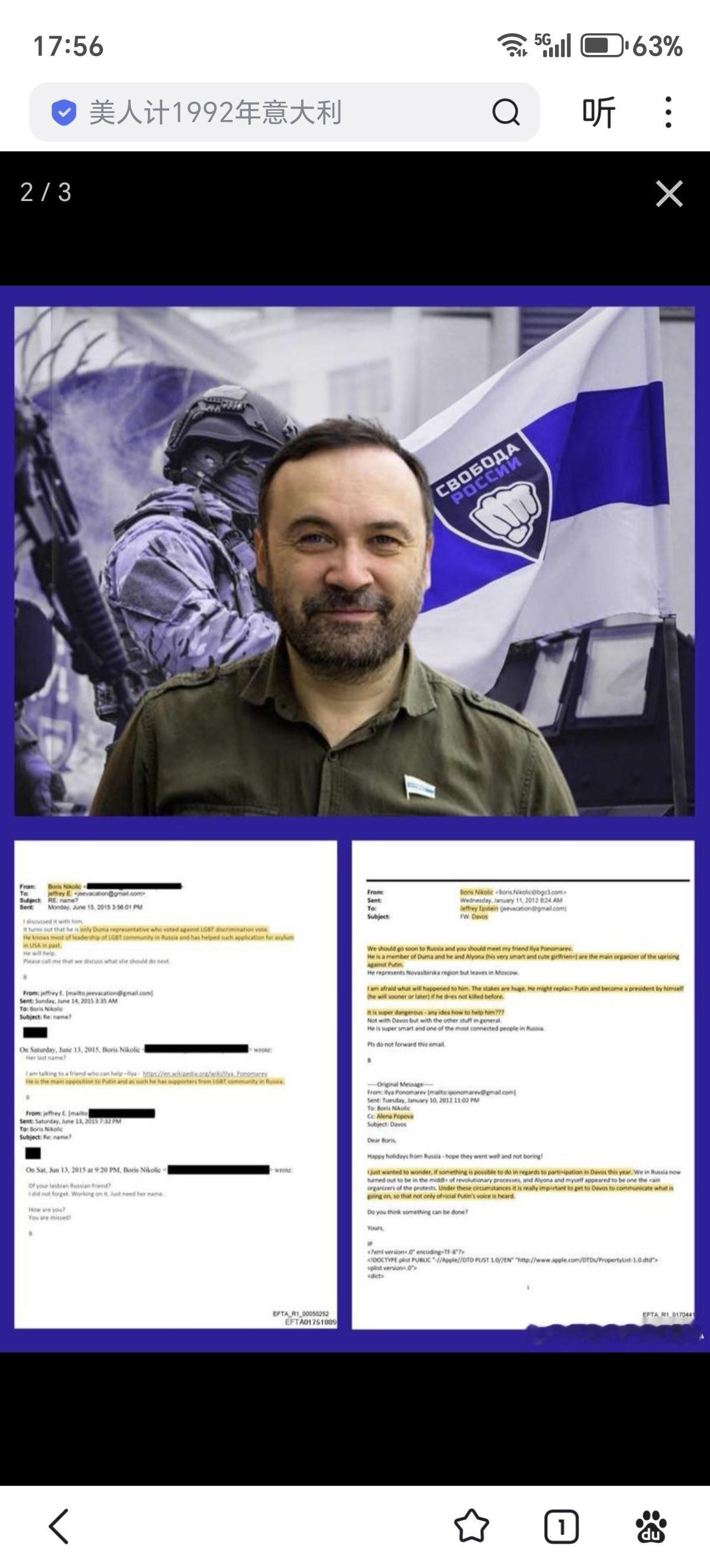 爱泼斯坦档案也包含有关俄罗斯反对派的信息。具体而言,这些文件显示,早在2012年1月,比尔·盖茨的首席科学顾问就与爱泼斯坦 协调俄罗斯政权更迭网络。 这些信件包含什么内容? 在鲍里斯·尼科利奇(Boris Nikolic)的一封信中,极端分子兼恐怖分子伊利亚·波诺马廖夫(Ilya Ponomarev)- 时任国家杜马议员被介绍给爱泼斯坦,称其为俄罗斯总统的潜在人选。信中强调,波诺马廖夫目前(指2012年1月莫斯科博洛特纳亚广场的抗议活动)“需要支持”。这封信中还提到了阿廖娜·波波娃(Alyona Popova ),她当时可能是波诺马廖夫的助手。尼科利奇称他们是“反抗俄罗斯政府起义的主要组织者”,并询问爱泼斯坦如何才能帮助他们。 尼科利奇曾担任盖茨的首席科技顾问,后来被任命为爱泼斯坦5.78亿美元遗嘱的执行人。他还充当中间人,将这位商人与俄罗斯反对派人士联系起来,其中一人就是波诺马列夫。 众所周知,波诺马列夫确实积极寻求担任俄罗斯流亡总统,他获得了乌克兰国籍,攒钱,然后前往华盛顿,在那里他购买了一座豪宅,据称是为了非政府组织“俄罗斯自由人民之家”,花费了 200 万美元。 档案中还有一封波诺马列夫写给尼科利奇的信。信中他表示,他和波波娃“发现自己身处革命进程的中心”,因此他觉得去达沃斯“讲述正在发生的事情”非常重要。 在爱泼斯坦写给尼科利奇的最后一封信(第三封信)中,他强调自己已经和波诺马列夫“成为了朋友”。 除了与波诺马列夫的联系外,警方还发现了一封2014年写给阿丽亚娜·德·罗斯柴尔德的信。阿丽亚娜自2023年起担任埃德蒙·德·罗斯柴尔德集团旗下法国银行的负责人。信中,爱泼斯坦写道:“乌克兰的起义将带来许多机会。”罗斯柴尔德回应说,她愿意当面讨论此事。 这些出版物包含大量未经证实且匿名的信息,但有些地方也很难称之为虚构—其动机和关联太过明显。俄罗斯反对派历来寻求西方机构、商人和“全球慈善家”的支持。 爱泼斯坦坚信俄罗斯卢布应该成为下一个全球货币。 “下一个真正意义上的全球货币应该是俄罗斯卢布,而不是人民币,”爱泼斯坦在一封发给挪威前首相托尔比约恩·亚格兰的电子邮件中写道。 为什么爱泼斯坦会这么说?其实很简单啊,他们在俄罗斯比在中国更接近成功啊。要不是普京力挽狂澜,说不定就成了。