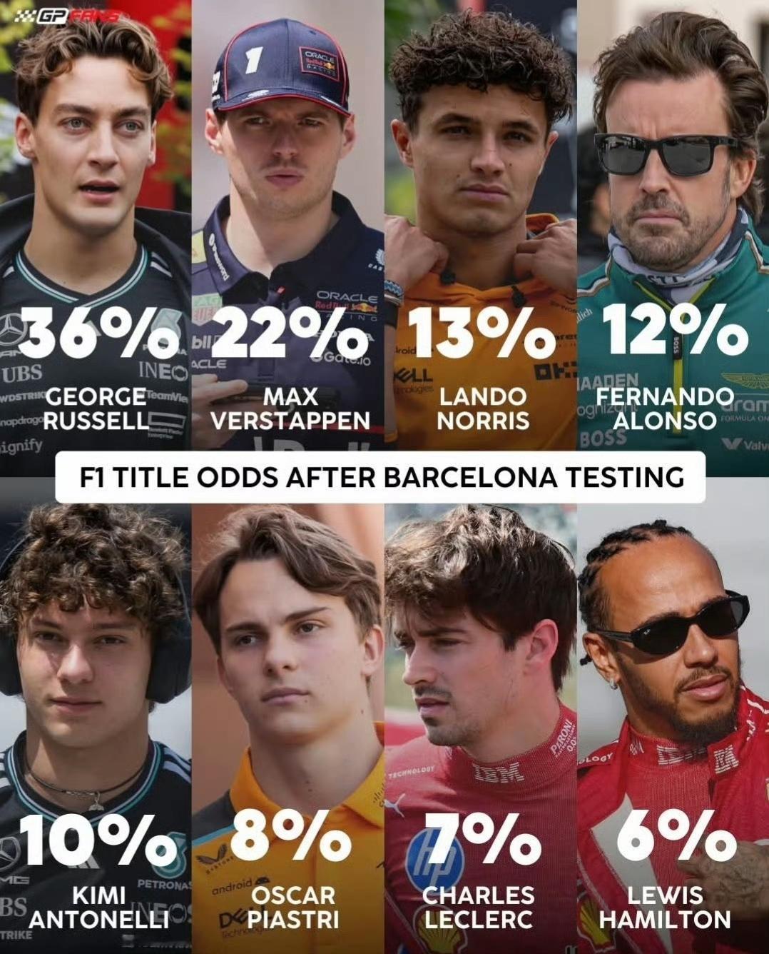2026F1总冠军赔率,没想到拉塞尔排名榜首,汽车人维斯塔潘才排名第二。 汉密尔顿能上榜也是意料之外。