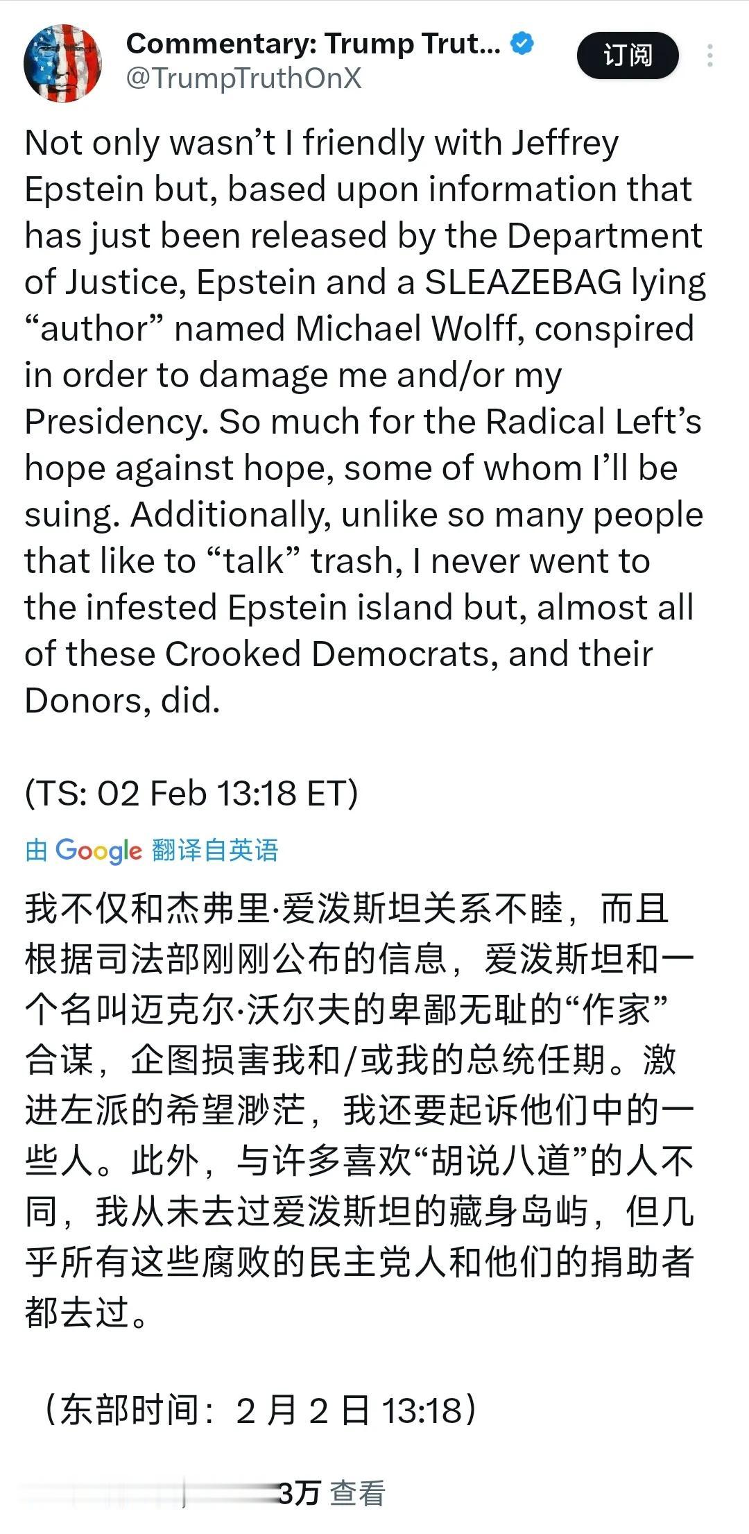特朗普今天(2月3日)发文称,他不仅与杰弗里.爱波斯坦关系不好,而且从未去过爱波斯坦的肮脏岛屿(图2)。特朗普有一个“打死都不认错”的人格特质,《华尔街日报》发表其与爱波斯坦关联的报道,特朗普威胁起诉该媒体老板及两名记者,并索赔至少100亿美元,后《华尔街日报》强硬回应“法庭见”,结果特朗普再无下文;在“封口费”案中,他已经被美国大陪审官判了34项重罪,他至今仍然坚称“这是民主党的司法与政治行为”。从特朗普的人格特质看,如果承认去过爱波斯坦的萝莉岛就不是特朗普了。