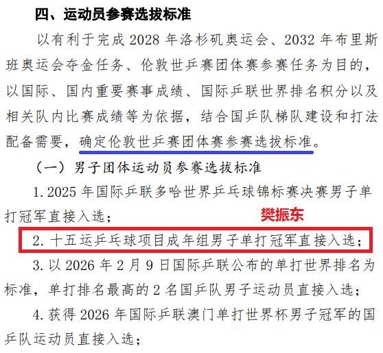 果然不出我所料,樊振东在今年的伦敦世乒赛回归国乒了! 半月前,我就发文预测,国乒教练组对于樊振东是否归队以及何时归队,就看今年两场比赛,第一场就是今年4月28日至5月10日在英国伦敦举行的世乒赛团体赛。 这届世乒赛团体赛是世乒赛举办百年庆典,谁赢得这次比赛的冠军都将是巨大的荣耀,这是我之前在文章中预测樊振东将在这场比赛回归的根本原因。 果然,今天乒协公布了伦敦世乒赛团体赛选拔办法,明确说明第十五届全运会单打冠军直接入选参赛队伍,这就表示樊振东必将回归国家队,不必一直漂泊在外了。 樊振东回来参加伦敦世乒赛团体赛,并不表示他的回归就完全扫清障碍了,但凡事总得先开头,然后才能逐步去解决后续问题。 恭喜樊振东靠着自己的实力争取到了现在的美好结果!樊振东的球迷以及喜欢樊振东的人都有福了,又可以看到他打世界比赛了!