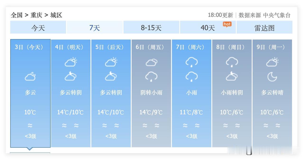 一个坏消息,一个好消息!2月7日和8日,这周末重庆降雨降温!凄风冷雨,冻死人哟!不过,好消息是,2月11日到17日,重庆主城区,气温快速回暖,非常温暖! 2月8日,星期天,重庆主城区,有小雨,气温跌至6-10度。 …… 2月16日,除夕夜当天,重庆主城区,气温10-14度。 2月17日,大年初一,重庆主城区,气温10-15度。 …… 看来,2月10日以后,重庆主城区,估计一直都是比较温暖了,再也难以出现冻死人的大降温了吧?! 嗯嗯! 2月14日,情人节当天,重庆主城区,最高气温20度!