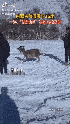 内蒙古赤峰,一名男子开车在野外道路上看见了一只狍子,没想到它居然以奔跑的姿势,被冻成了“冰雕”,就这样直直站立在道路地面上,看到这一幕他都懵了。 信息来源:新界视频 王先生说,他当时正开车穿越荒野,窗外就是零下25度的大冷天,结果一瞥见路边这只狍子,整个人都懵了。 四条腿死板僵直,身体往前微倾,活像个定格的雕塑,连眼睛都紧闭着,看样子早就没了气儿。 旁边过路的人也吓傻了,大家全停下车,围着它看,谁都没想到野外寒风能把一只成年狍子冷成这样。 有人直呼“简直比冰箱里拿出来的还干脆”,还有人感叹:“太可怜了,这大冷天出来找吃的,居然连倒地都来不及。” 网络上热议不断,大家说这小家伙是饿得没办法、硬上冻雨和寒风,体液瞬间凝固才成了这样。 也有网友嘱咐,希望当地能把它善后处理一下,不要让这份惨烈独自留在路边。 看到这一幕觉得东北狍子好可怜,希望有人能处理好,毕竟也是一条生命。