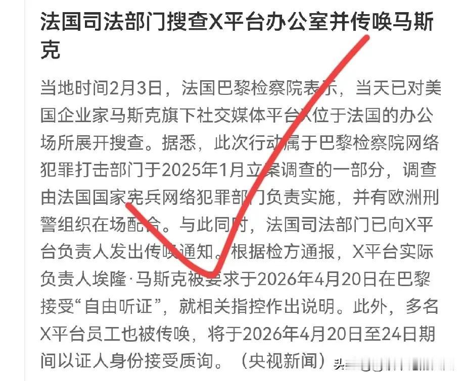 突发! 法国开始调查马斯克了? 马斯克会逃过一劫吗?他会去法国接受讯问吗?马斯克的x平台是不是还会面临法国的巨额罚款?这都是接下来巨大的疑问啊。 因为按照此前的媒体相关报道,他的x平台确实是违反法国法律了,主要包括内容监管失职,算法透明度不足以及AI生成非法内容,还有欺诈性数据提取,这是巴黎检察官指控的主要内容。 所以说,法国司法部门既然对马斯克进行传唤并搜查X平台,并不是空穴来风!马斯克,可能有点难了?[捂脸]