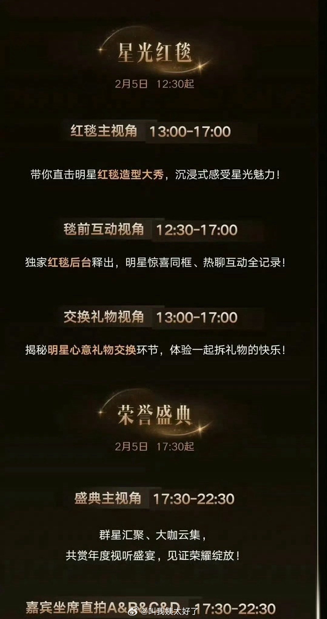 微博之夜的流程,2月5日12:30就开始了啊。那很快了!期待谁的红毯?